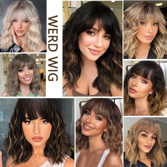 WERD Short Ombre Blonde Wavy Wig for Women Blonde Curly Wavy Bob Wig with Bangs Natural Looking Synthetic Dirty Blonde Wig for Colorful Cosplay