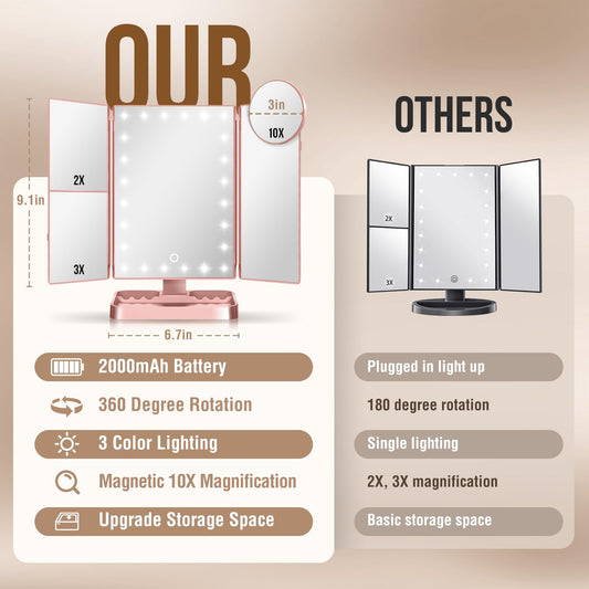 NIKKOMON Wireless Rechargeable Lighted Makeup Mirror with 3 Color Lighting, 2000mAh Rechargeable Battery, 10x 3X 2X Magnification Mirror, 24LMirror, 360 Degree Rotation, Gift for Woman (Rose Gold)