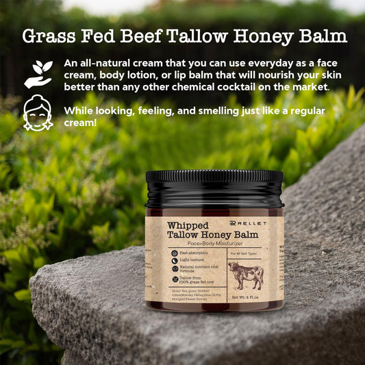 Beef Tallow and Honey Balm for Skin: 4oz Grass Fed Whipped Beef Tallow With Honey Face Body Moisturizer - Organic Unscented Fast Absorption Tallow Cream Infused with Manuka Honey Beeswax Olive Oil