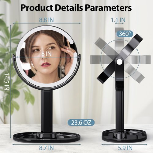 8" Lighted Makeup Mirror with Magnification, 1X/10X Magnifying Mirror with Light, Rechargeable Double Sided LED Vanity Mirror, 360° Rotation Light up Mirror 3 Colors Brightness Adjustable, Black