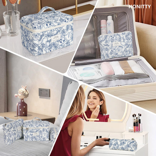 Makeup Bag,Quilted Cosmetic Bags,Large Floral Make Up Organize bag,Makeup Bag Set for Women,Flower Travel Toiletry Bag