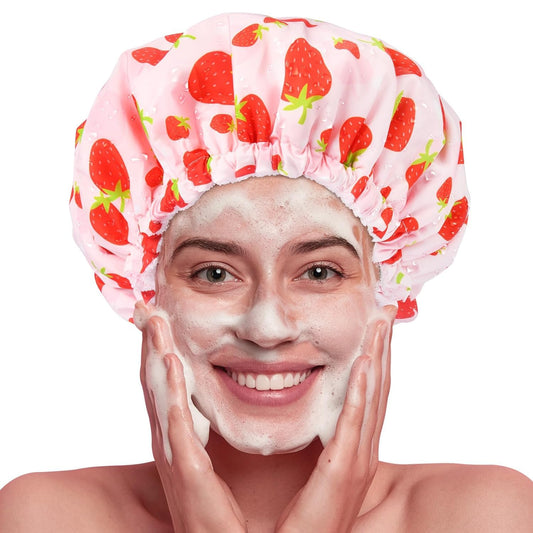 Shower Cap for Women Terry Lined Bath Cap Large Reusable Waterproof Elastic Band Pink Shower Caps for Long Thick Hair Soft Bath Shower Hair Caps