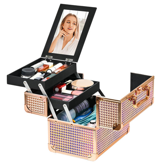 GALHUBIS Makeup Train Case, Portable Makeup Case with Mirror, 2-Trays Cosmetic Organizer Case,Nail Polish Organizer, Travel Makeup Box, Profesional for Salon Barber, Colorful Pink