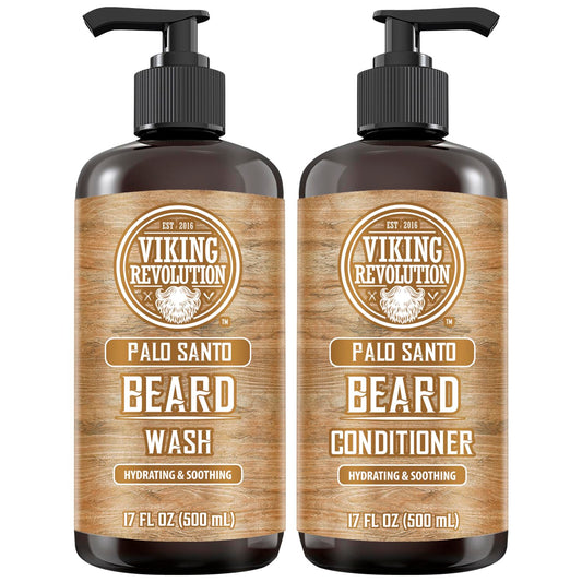 Viking Revolution Palo Santo Beard Wash and Beard Conditioner Set with Argan and Jojoba Oils - Softens and Strengthens - Natural Palo Santo Scent - Beard Shampoo with Ginseng Root Extract (17 oz)