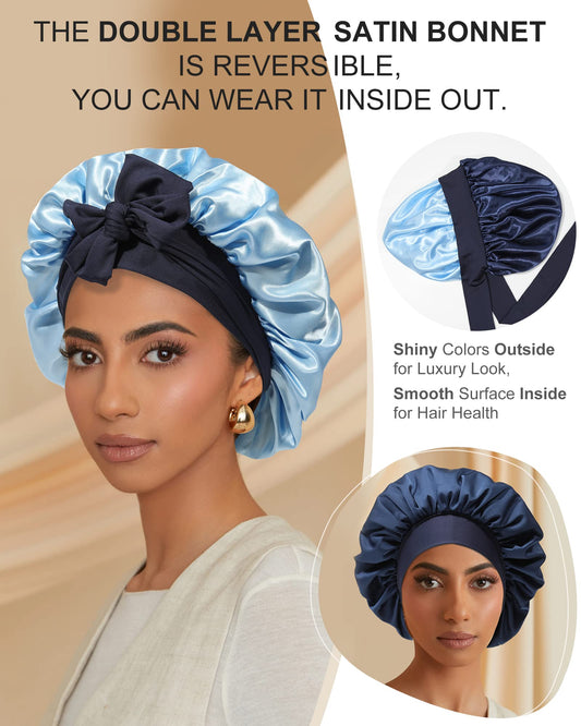 Satin Bonnet for Women Silk Bonnets for Sleeping Curly Hair Bonnet with Elastic Tie Band Reversible Double Layer Sleep Cap Hair Wrap (Navy Blue+Light Blue)