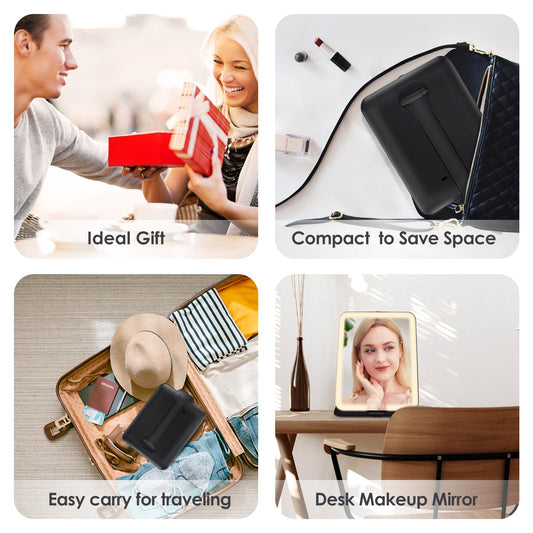 ESWU Travel Makeup Mirror with Light, Portable Folding Make Up Tabletop Mirror with 10X Magnifying Mirror Rechargable 3 Colors Light Compact Vanity Mirror with Adjustable Stand (Black)
