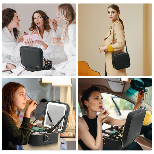 Mocado Travel Makeup Bag with LED Lighted Mirror,Travel Makeup Organizer,Makeup Case with 8 Makeup Brushes and 10x Magnifying Mirror,3 Colors Lighting, Adjustable Dividers Makeup Box(Black)