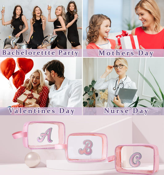 COSHAYSOO Clear Makeup Bag Preppy Initial Letter Cosmetic Toiletry Sunscreen Pouch Travel Essential Accessories Gifts for Women Girls Summer Camp Vacation Beach Pool Lake Hiking Road Trip Pink F