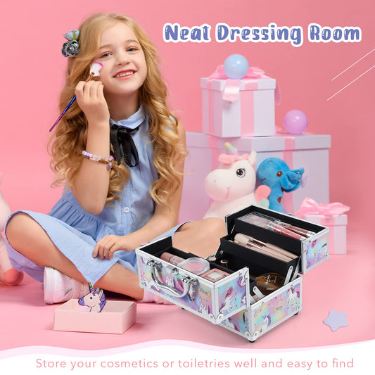 Frenessa Portable Makeup Train Case Cosmetic Box Storage Organizer Nail Polish Box Jewelry Case 4 Trays with Lockable Keys for Artist, Cosmetic, Hairstylist, Women and Girls, Unicorn Rainbow,