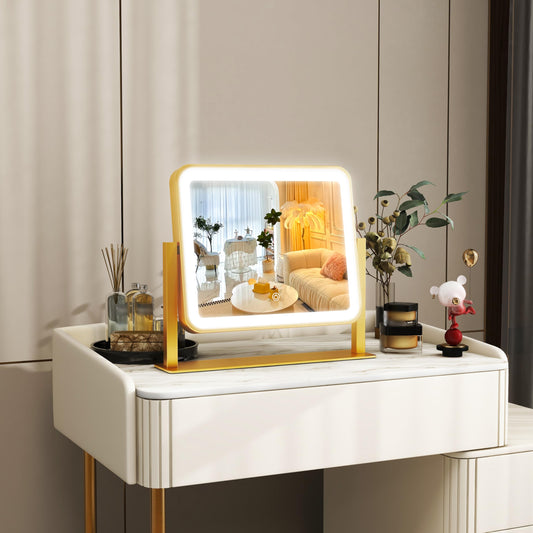 ROLOVE Gold Vanity Mirror with Lights, 14"×12" LED Makeup Mirror, Lighted Makeup Mirror with Lights, Smart Touch Control 3 Colors Dimmable, Lighted Up Mirror for Makeup Desk, 360° Rotation