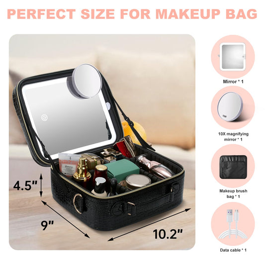 Mocado Travel Makeup Bag with LED Lighted Mirror, Travel Makeup Organizer, Makeup Case with 3 Color Lighted Setting and 10x Magnifying Mirror, Portable Storage and Adjustable Dividers (Crocodile)