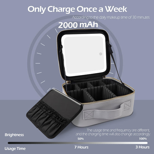 MOMIRA Travel Makeup Bag Cosmetic Bag Makeup Organizer Bag with Large Lighted Mirror 3 Color Scenarios Adjustable Brightness, Waterproof Makeup Travel Case(Grayish)