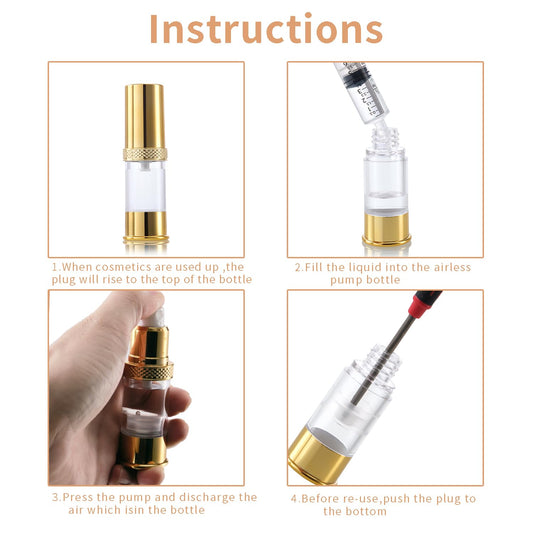 XQNCBY golden airless pump bottle with travel bag set with labels empty refillable cosmetic pump travel size containers hair oil, lotion and other liquids 5ml 10ml 15g(12 Packs)