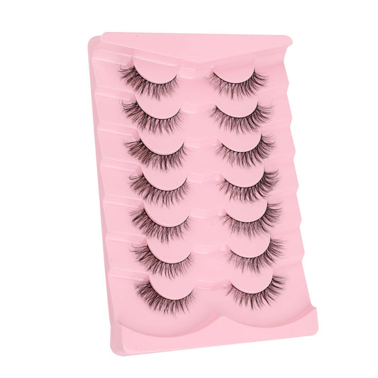 Eyelashes Natural Cat Eye Lashes 15mm Wispy Eyelashes Flared Fluffy Strip Lashes 0.1MM Thin Band False Eyelashes C Curl Lashes Siligli Eye Lashes Pack 7 Pair