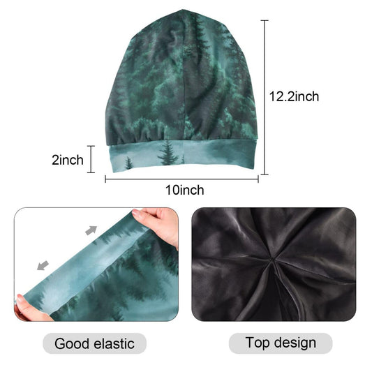 ElliTarr Beanie Hat Satin Bonnet Lined Sleep Cap Hair Wrap Cover Slouchy Beanie for Curly Hair Protection for Gifts for Men Women Foggy Green Mountains and Pine Trees