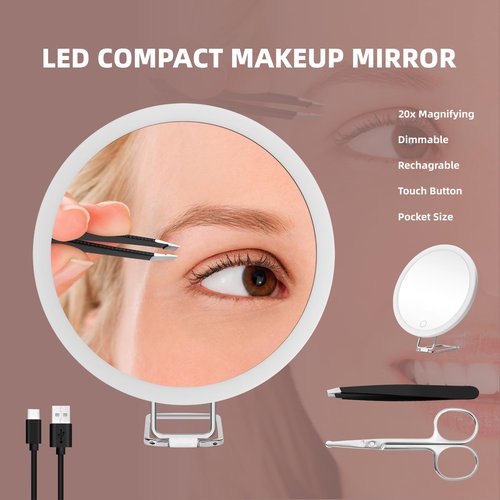 20X Magnifying Mirror with Light 6'' LED Makeup Magnifying Mirror with 3 Color Dimmable Makeup Mirror with 20X Magnification, Lighted 20X Travel Magnified Mirror, 3 Suction Cups, 360° Adjustable Stand