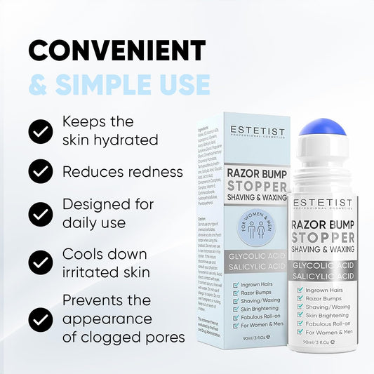 Razor Bump Stopper Solution for Ingrown Hair Skin Care Treatment for Face, Neck, Bikini Area, Legs and Underarm Area After Shave Serum Roll-On for Men and Women With Salicylic Acid, Glycolic Acid