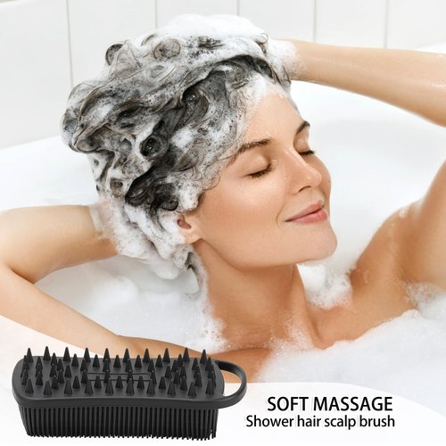 2 Pack Silicone Exfoliating Body Scrubber, 2 in 1 Body Brush & Hair Scalp Brush for Shower and Bath, Soft Silicone Loofah, Easy to Clean with Optimal Lathering (Black, Blue)