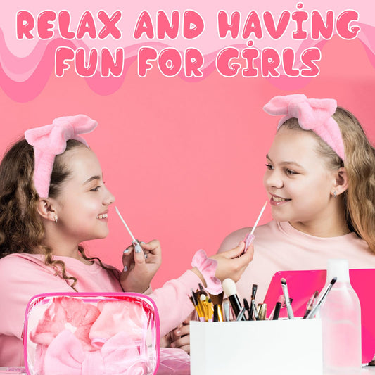 Mimorou 24 Pieces Sleepover Party Supplies Spa Party Favors 6 Spa Headband 6 Velvet Scrunchies 6 Makeup Remover Cloth 6 Clear Cosmetic Bags for Slumber Christmas Gift(Pink)