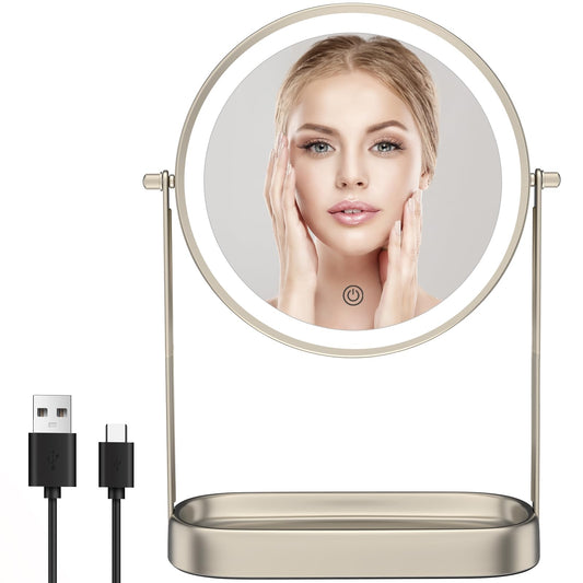 FASCINATE 10X Lighted Makeup Mirror with Storage, Rechargeable Magnifying Mirror with Lights 8", Brightness Adjustable, Double Sided 360°Rotation, Table Vanity Mirror 3 Color with Magnification