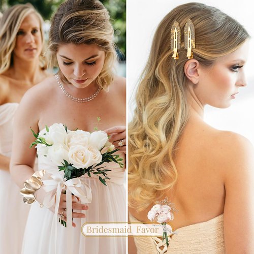 - đź’–Stylish and Elegant: These bridesmaid hair clips and hair scrunchies are specifically crafted for brides who desire a touch of elegance on their special day. The sleek and refined design of the clips effortlessly complements any bridal hairstyle, enhancing your overall appearance with a subtle yet glamorous charm.