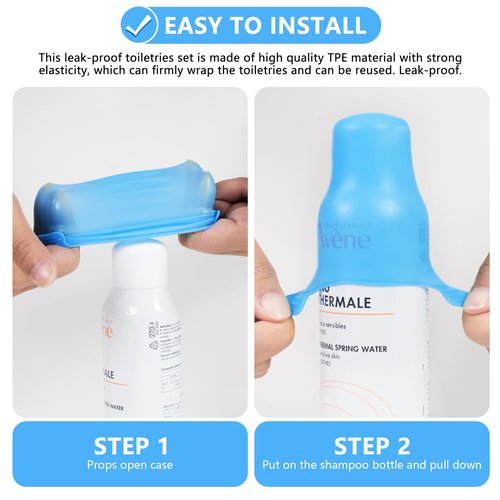 - [ Easy to install ] Put this Leak-proof sleeves over the shampoo, Stablely stays on toiletry containers,the silicone material can adsorb the bottle to avoid opening the leakage during the travel. Travel Accessories Very suitable for family travel, have four colors for your choice.