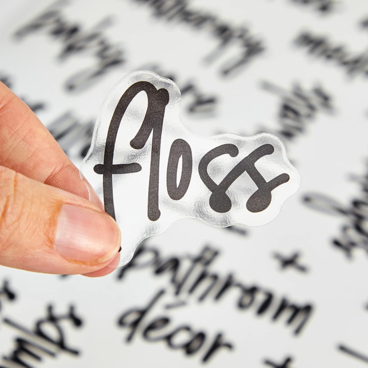 These clear bathroom labels in assorted shapes are styled in a black script font.