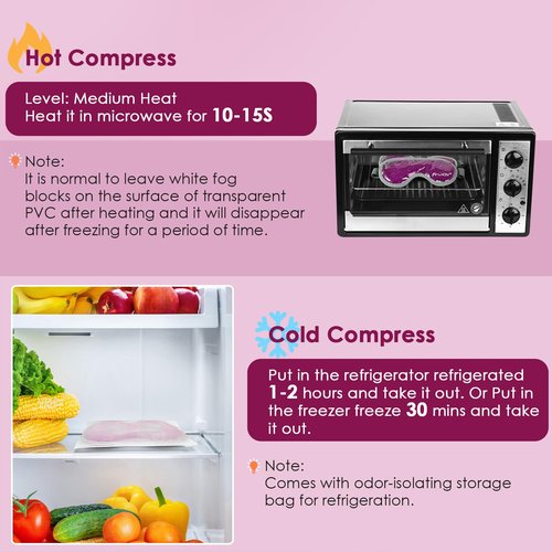 - ❄🔥❄【Hot and Cold Compress】Use our cold eye mask to create a eye ice pack to use for relieving puffy eyes, dark circles, headaches, or as a heated eye mask to use for dry eyes, tired eyes. Just simply put ice eye mask in the refrigerator for 1-2 hours for cold compress or heat it in the microwave for 10-15s for heat compress. Note: Put it in the freezer frozen for no more than half an hour. If the time is too long, it will become frozen and hardened, and the desired effect will not be achieved.