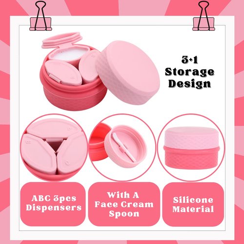 - ☑️ 3+2 Double Protection: This silicone containers adopt a new upgrated design, trendy and unique. There are 3pcs small individual dispensers (about 12ml) in the large storage box (about 82ml), which are distinguished with A, B and C, also including a plastic protective box and a small face cream spoon.