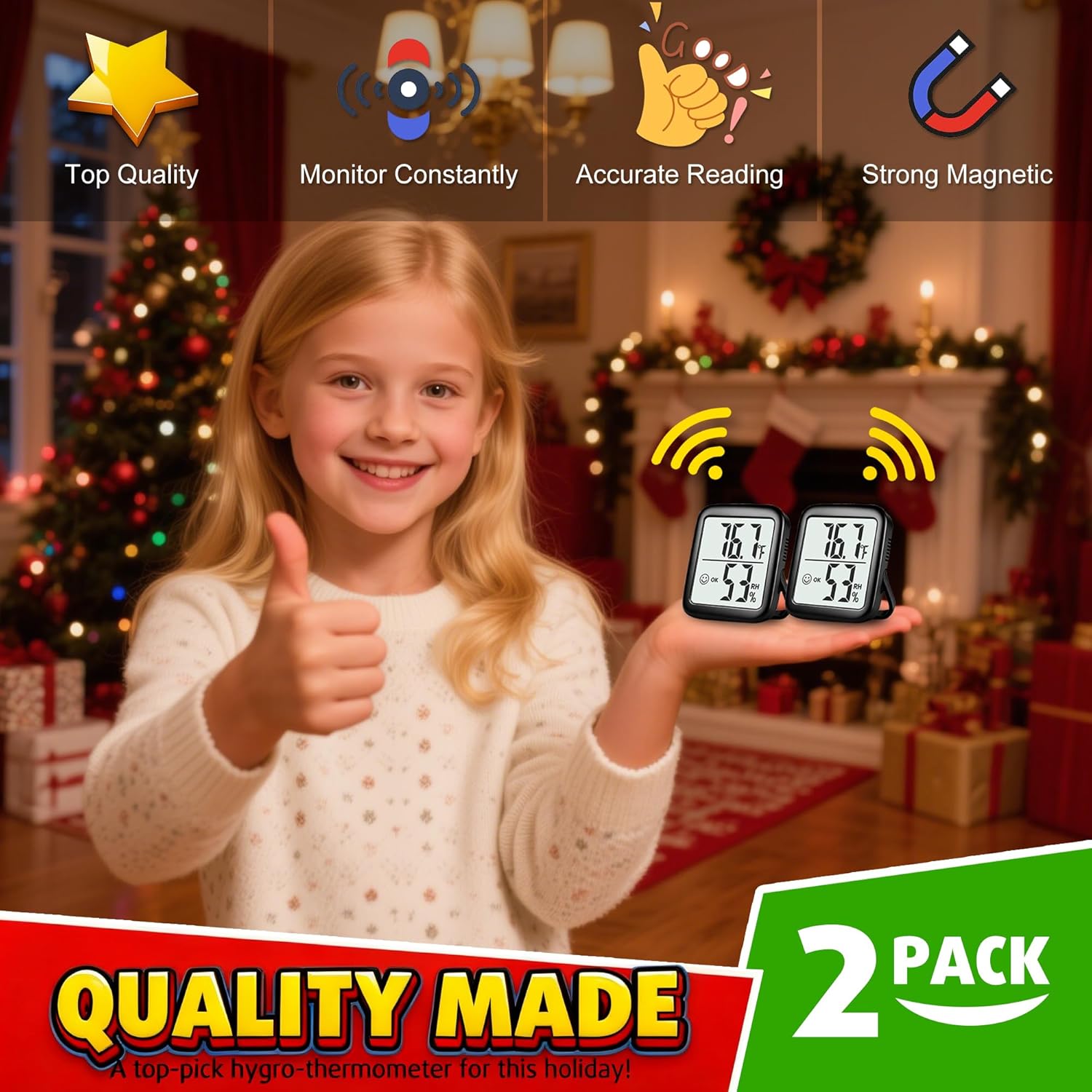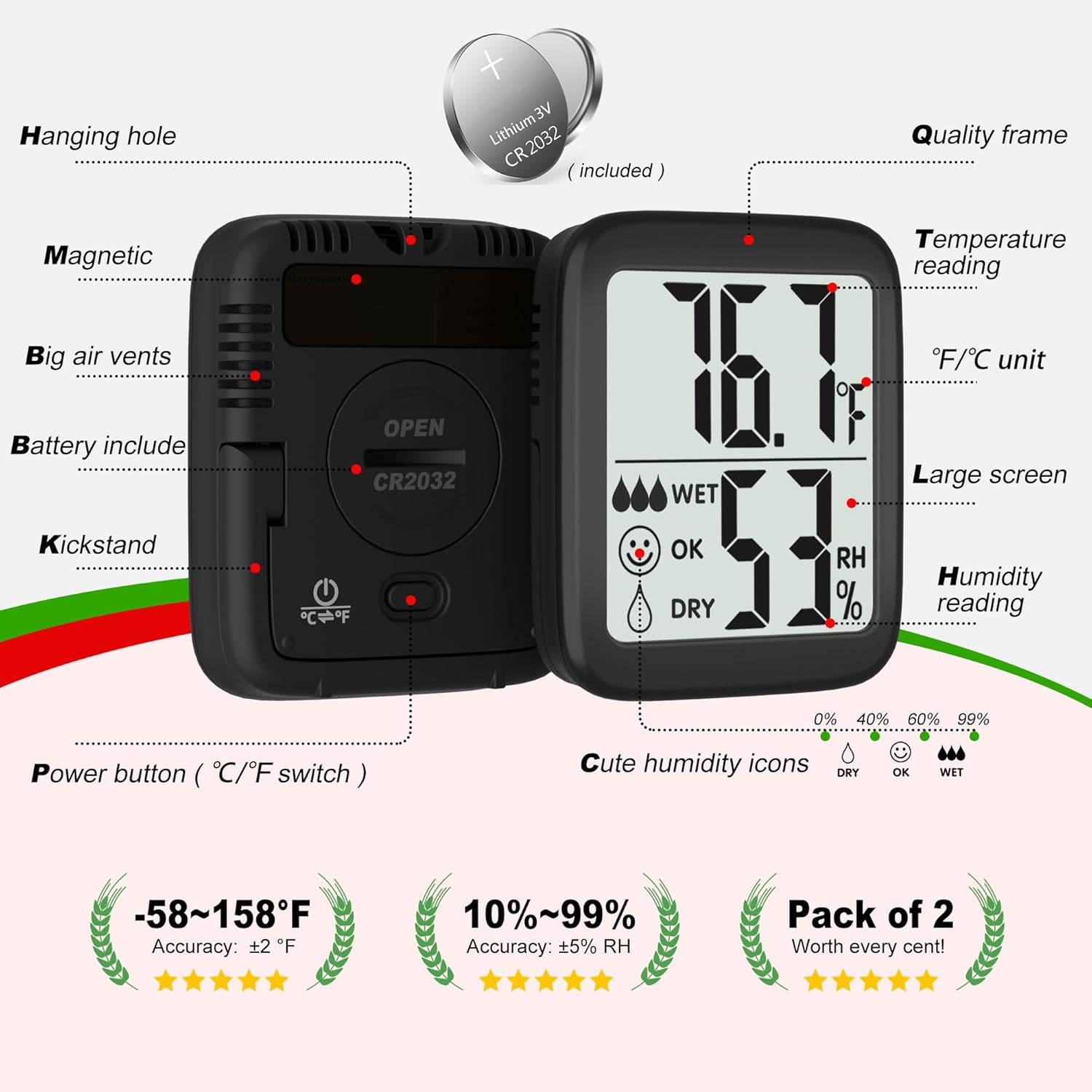 - This 2-pack indoor hygrometer thermometer helps monitoring room temperature and humidity in real time. Temperature range: -58 ~ 158 ℉( -50 ~ 70℃ ), Humidity range: 10%~99%