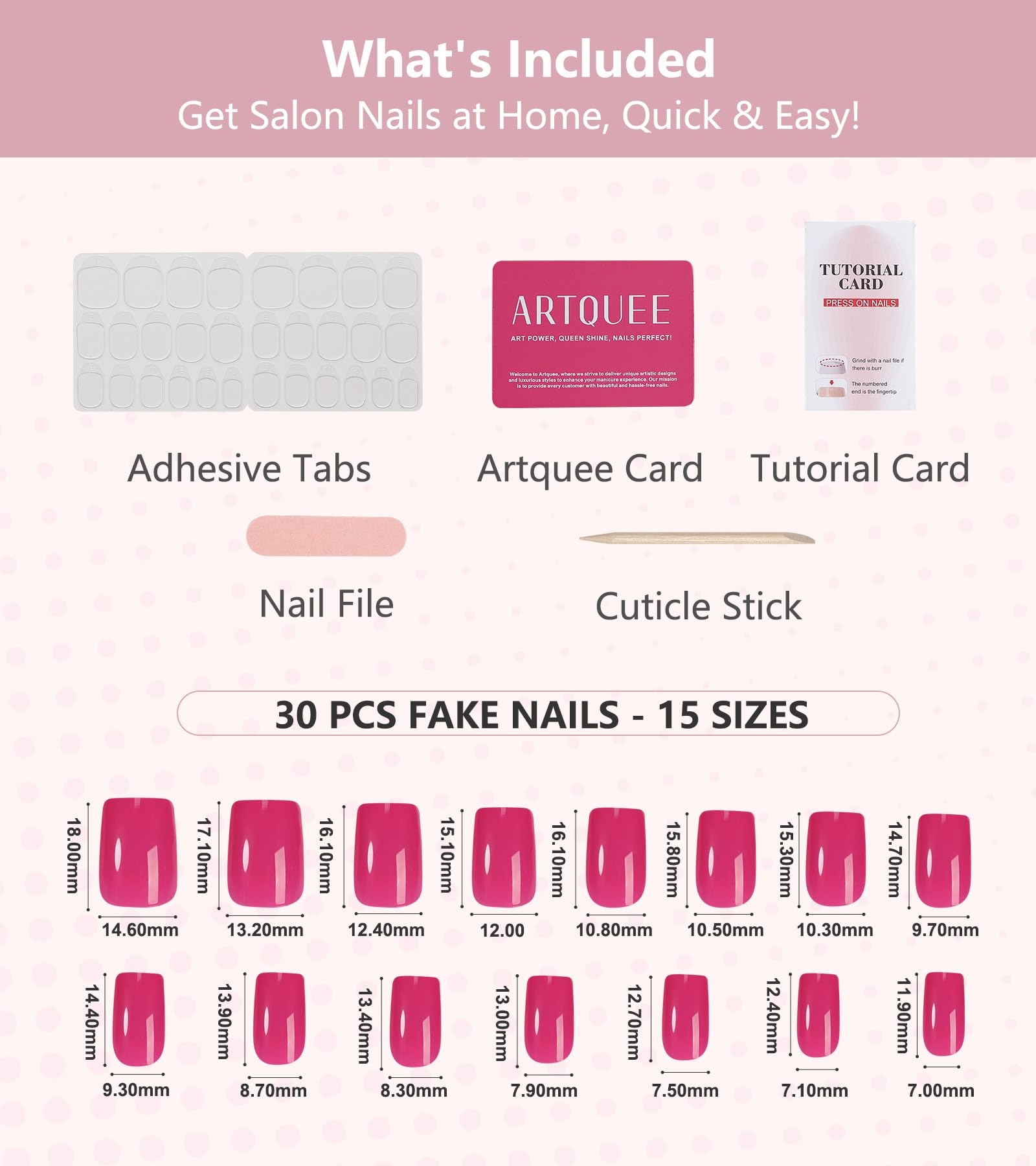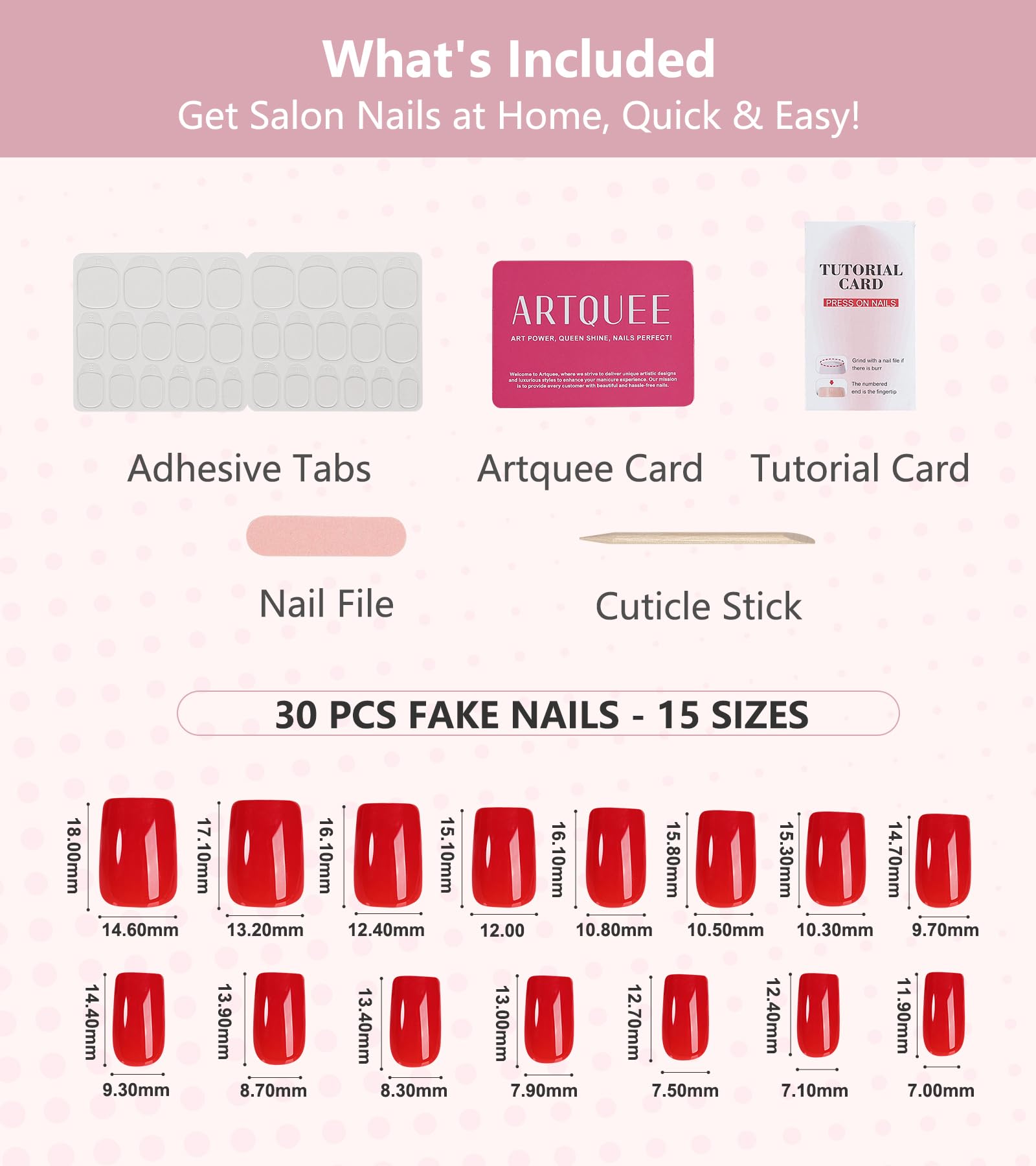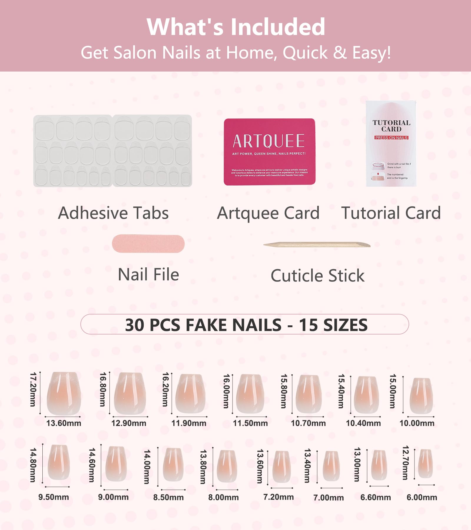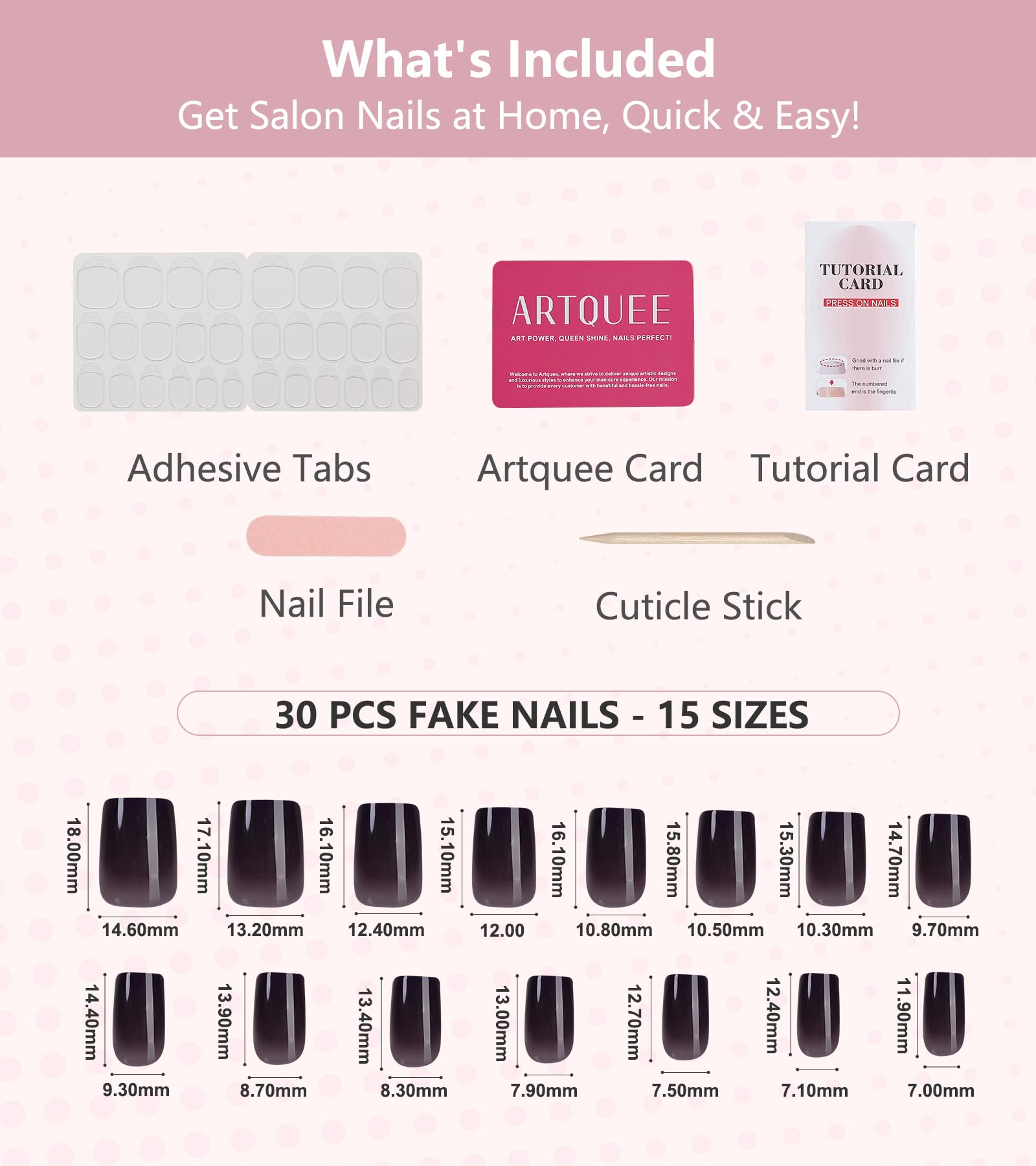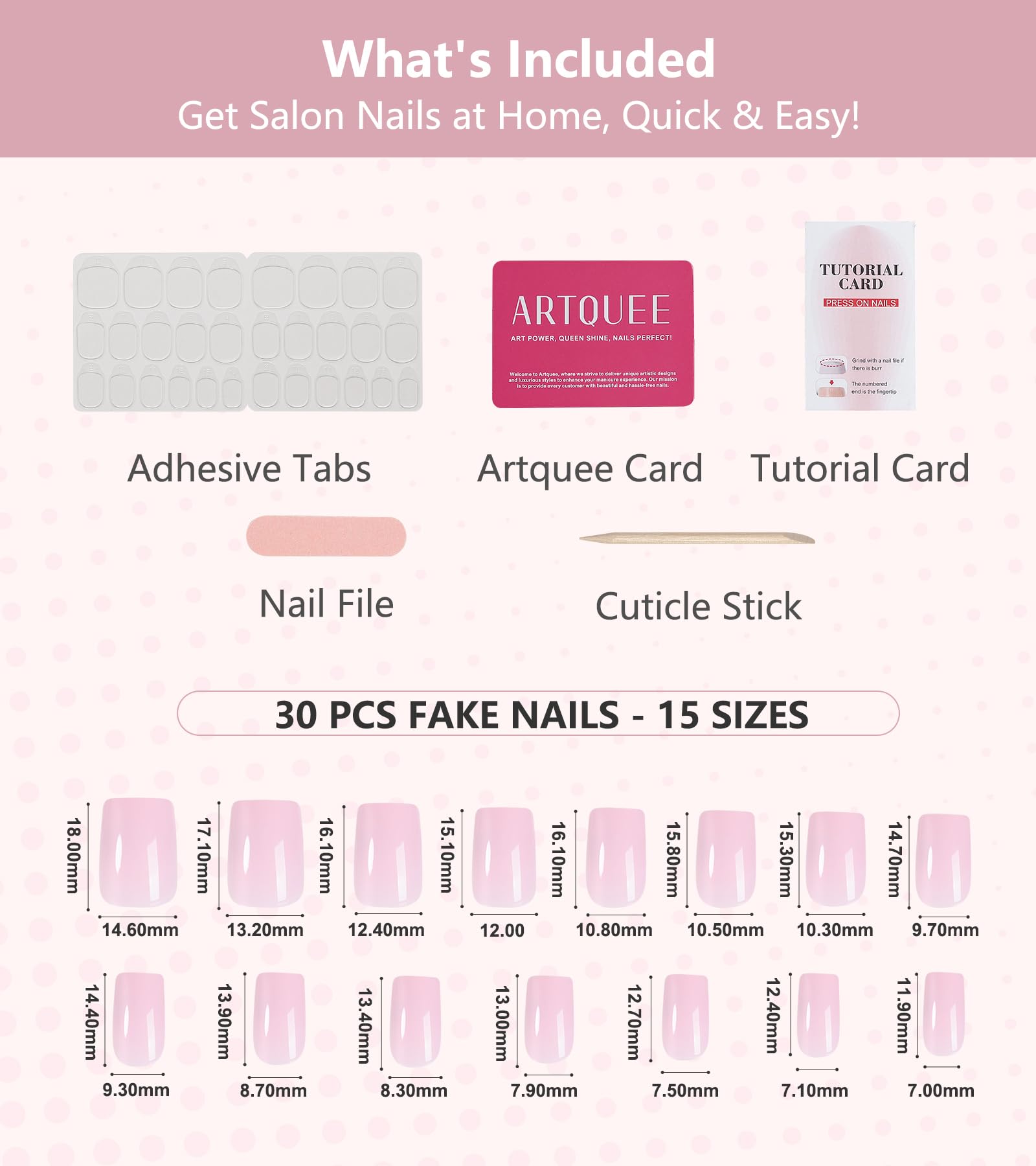 - What's included: 30pcs pre-designed press on nails come in 15 sizes to ensure a good fit on your fingernail beds. There are adhesive tabs, mini file, cuticle stick, and tutorial card, allowing you to easily create amazing manicures at home