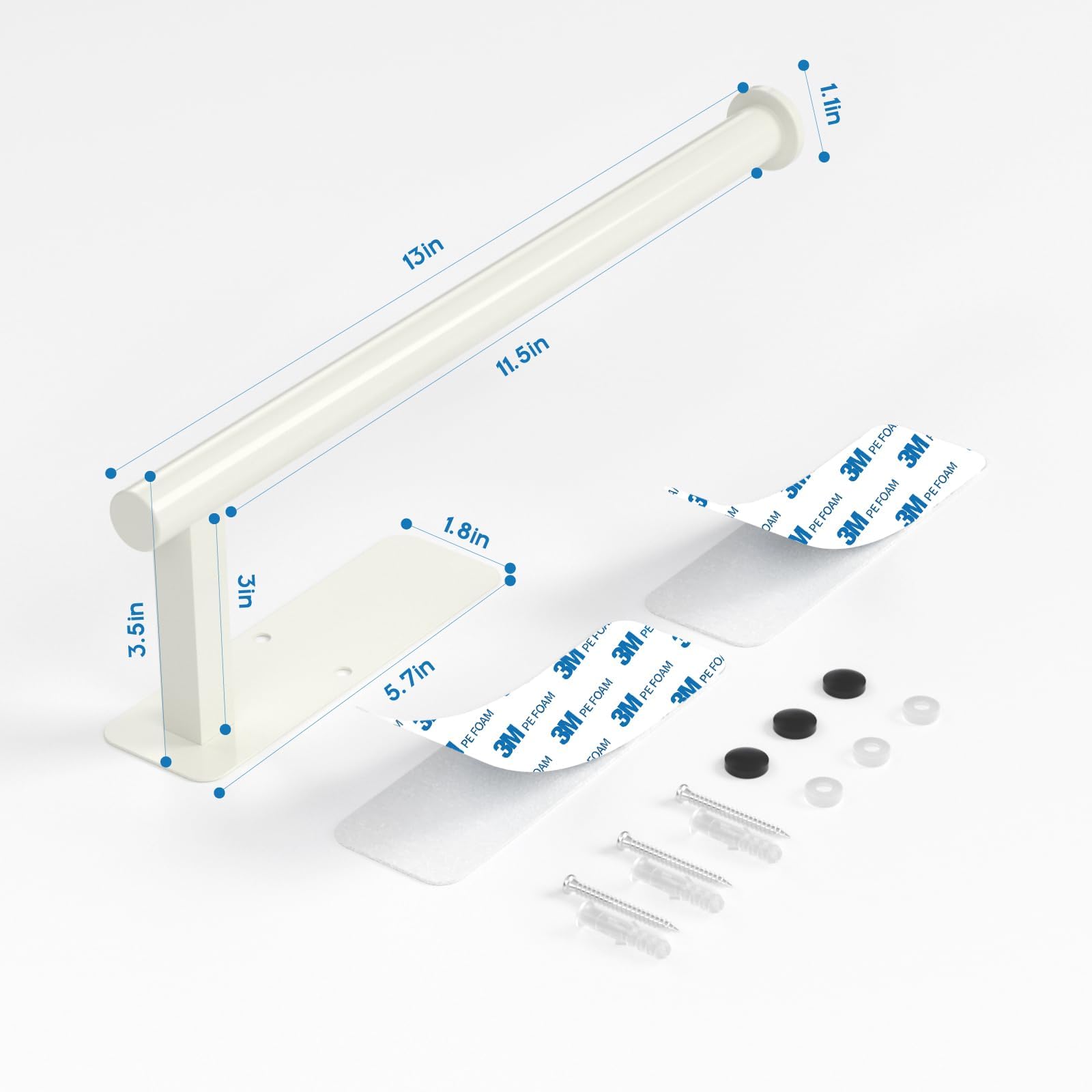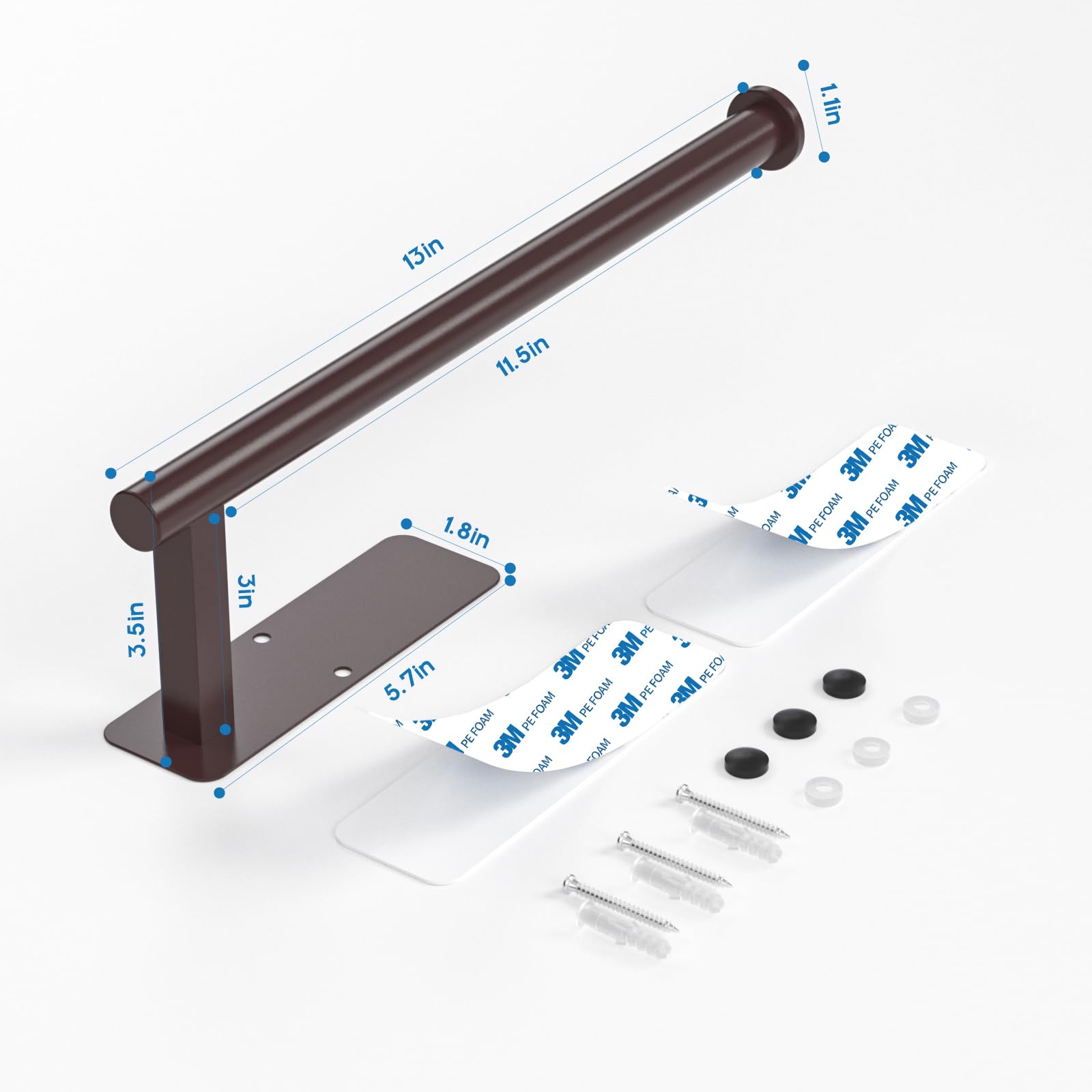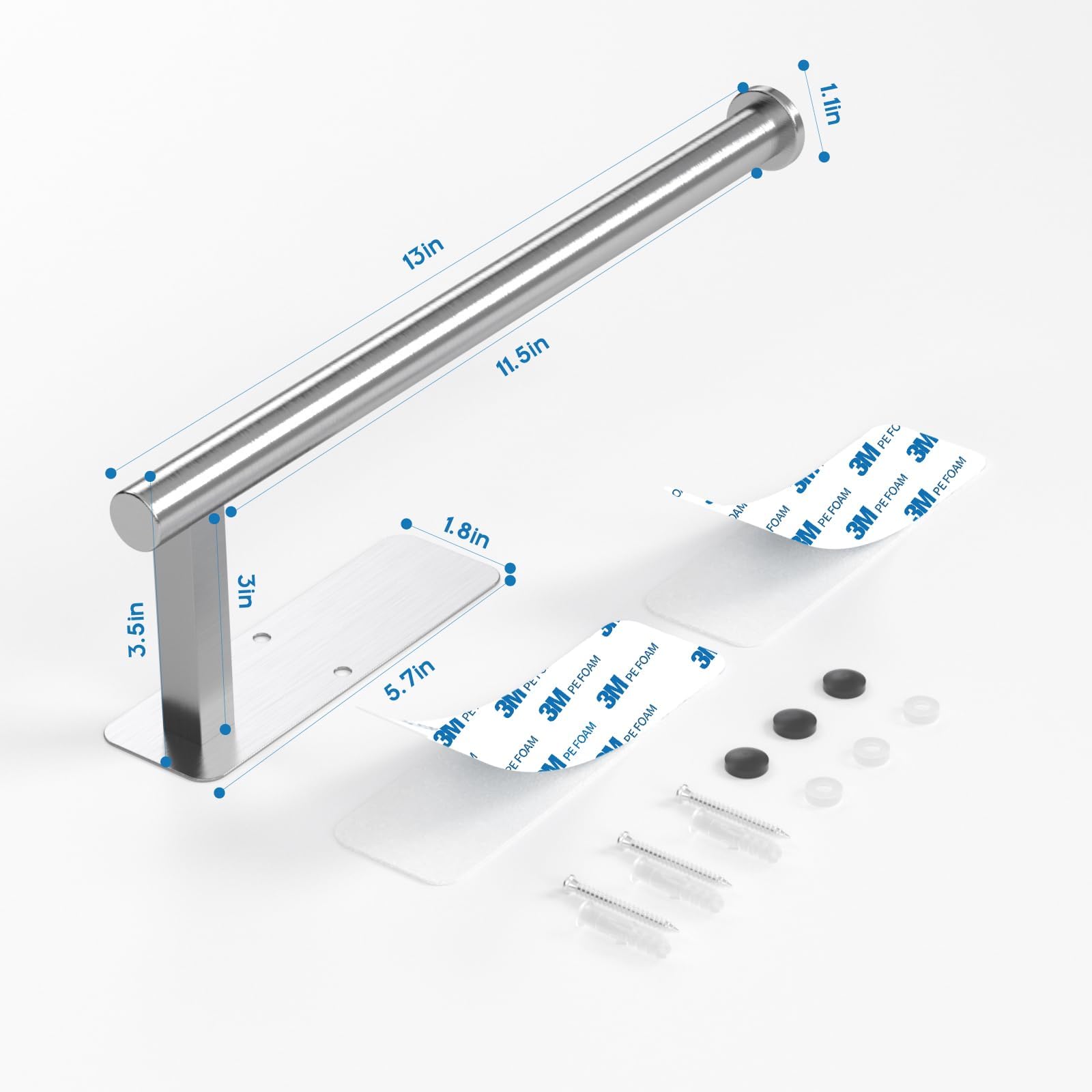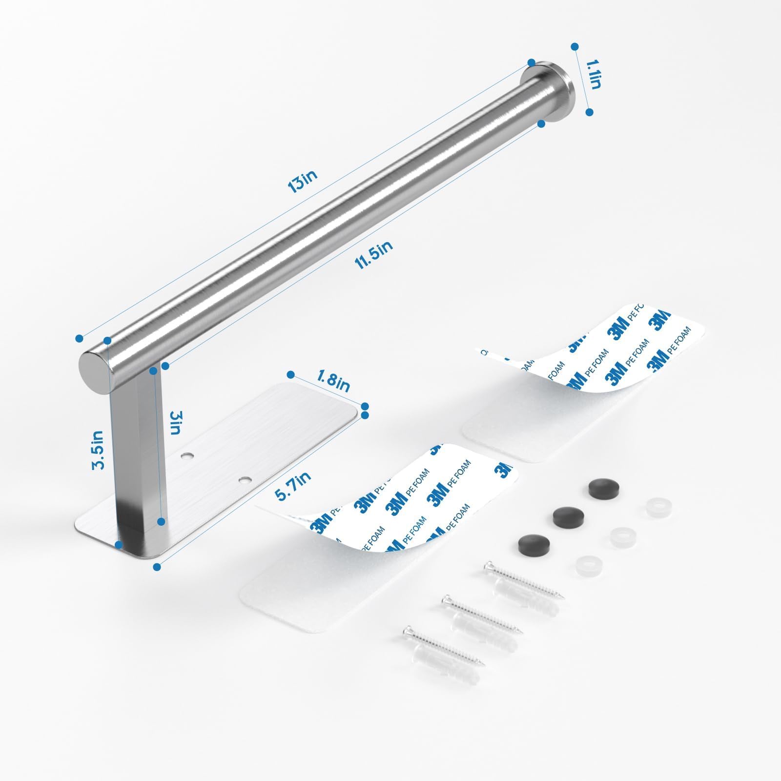 - ☞【Paper Towel Rack Material】: Self adhesive no drilling paper towel holder made of standard SUS304 stainless steel,anti-scratch, waterproof, after various of tests, paper towel rack total bar length: 12.6 inches, distance from the wall: 3 inches, fits all different mega sizes of rolls. The max loading can reach 22lb