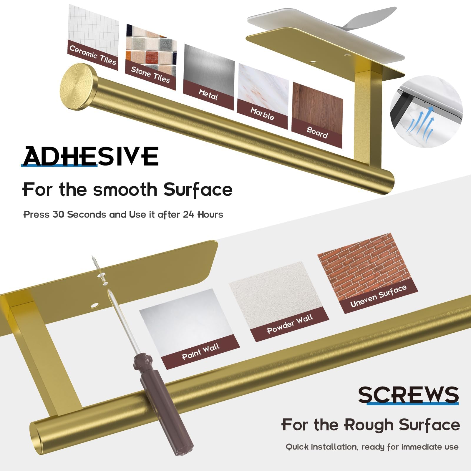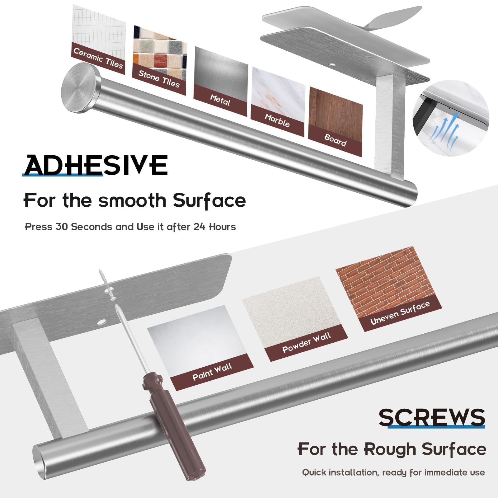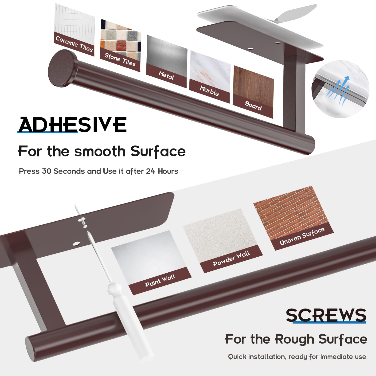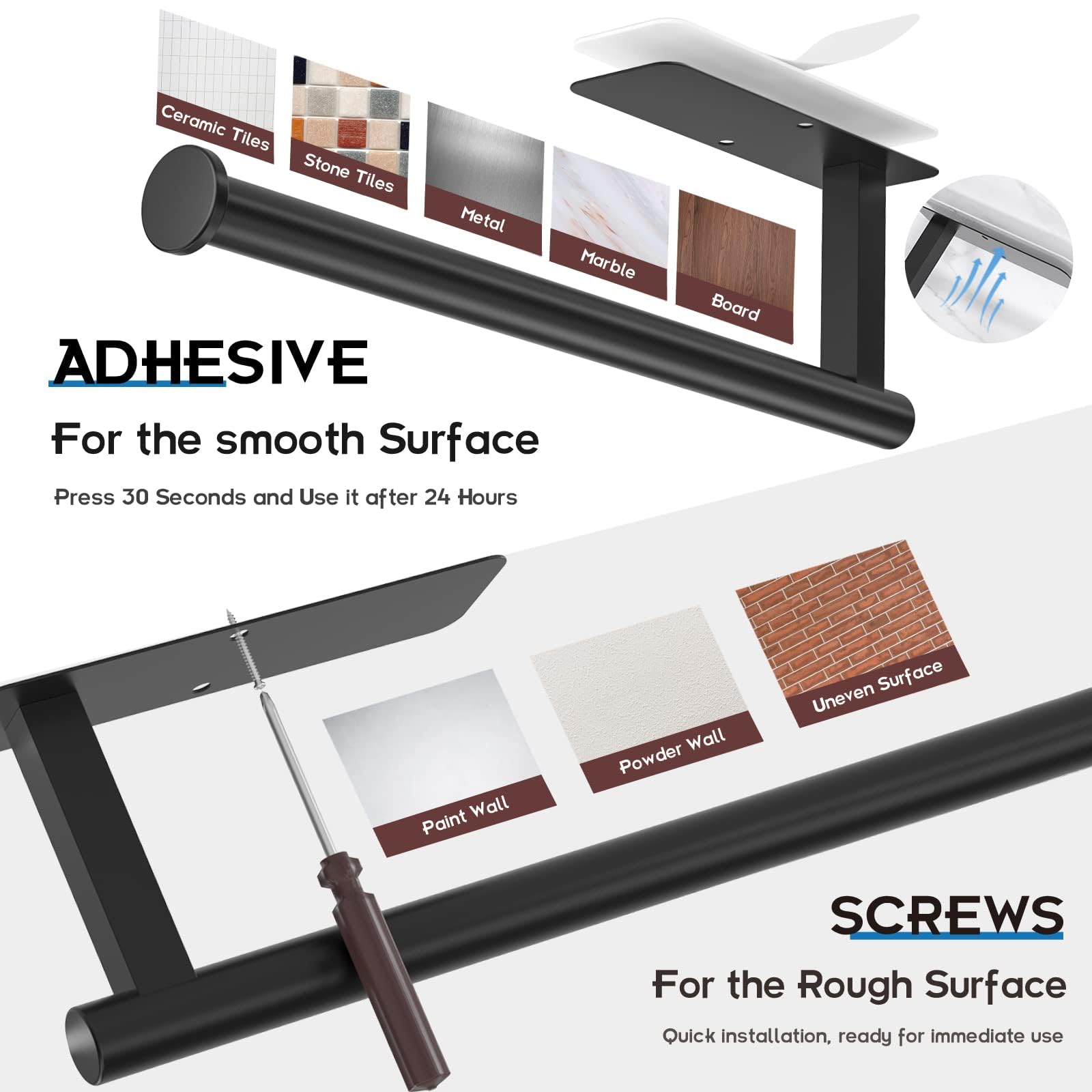 - ☞【Multiple Installation Options】: Applicable for both adhesive and screws. Self adhesive paper towel holder design suits smooth surfaces as tiles, glass, wood, marble, metal. Install and fix with auxiliary stickers, press stick on paper towel holder for about 20 seconds then use it after 24 hours. On rough surfaces, paper towel holder wall mount can be installed with screws
