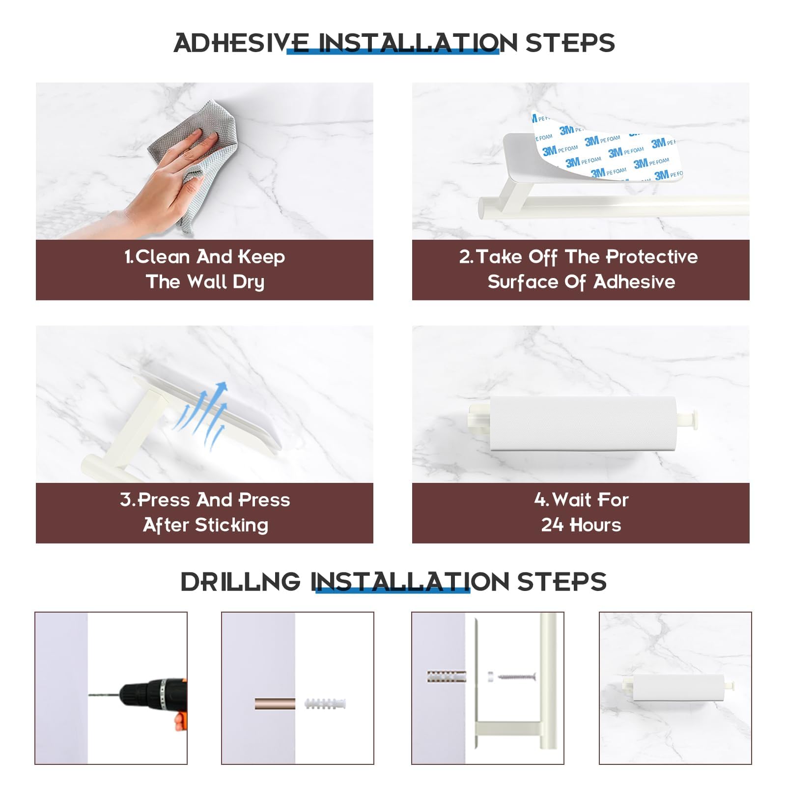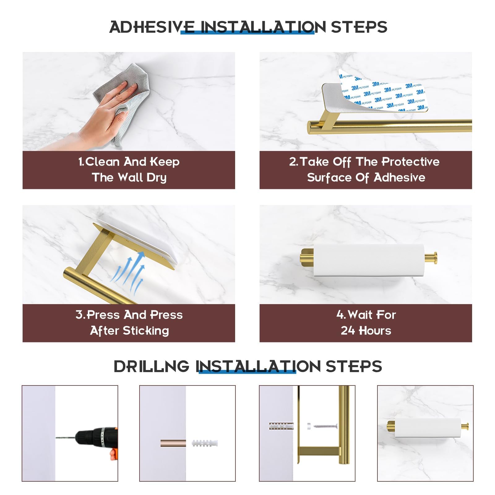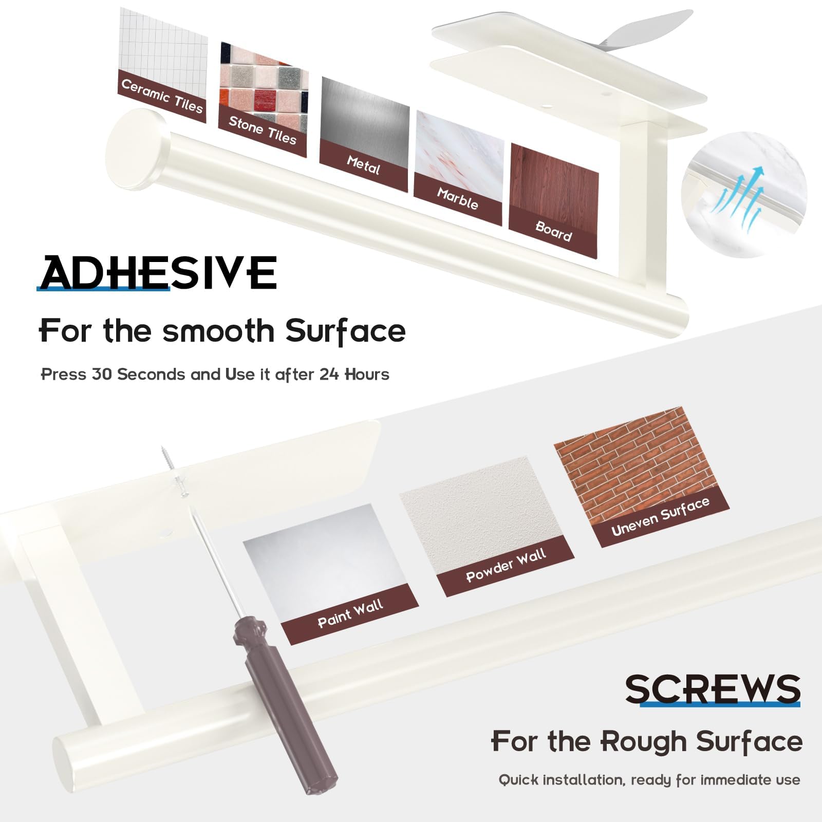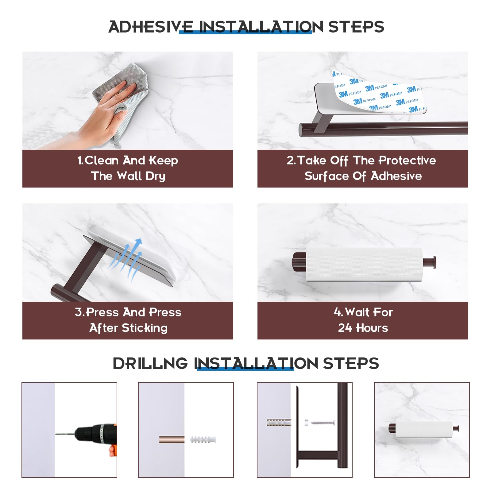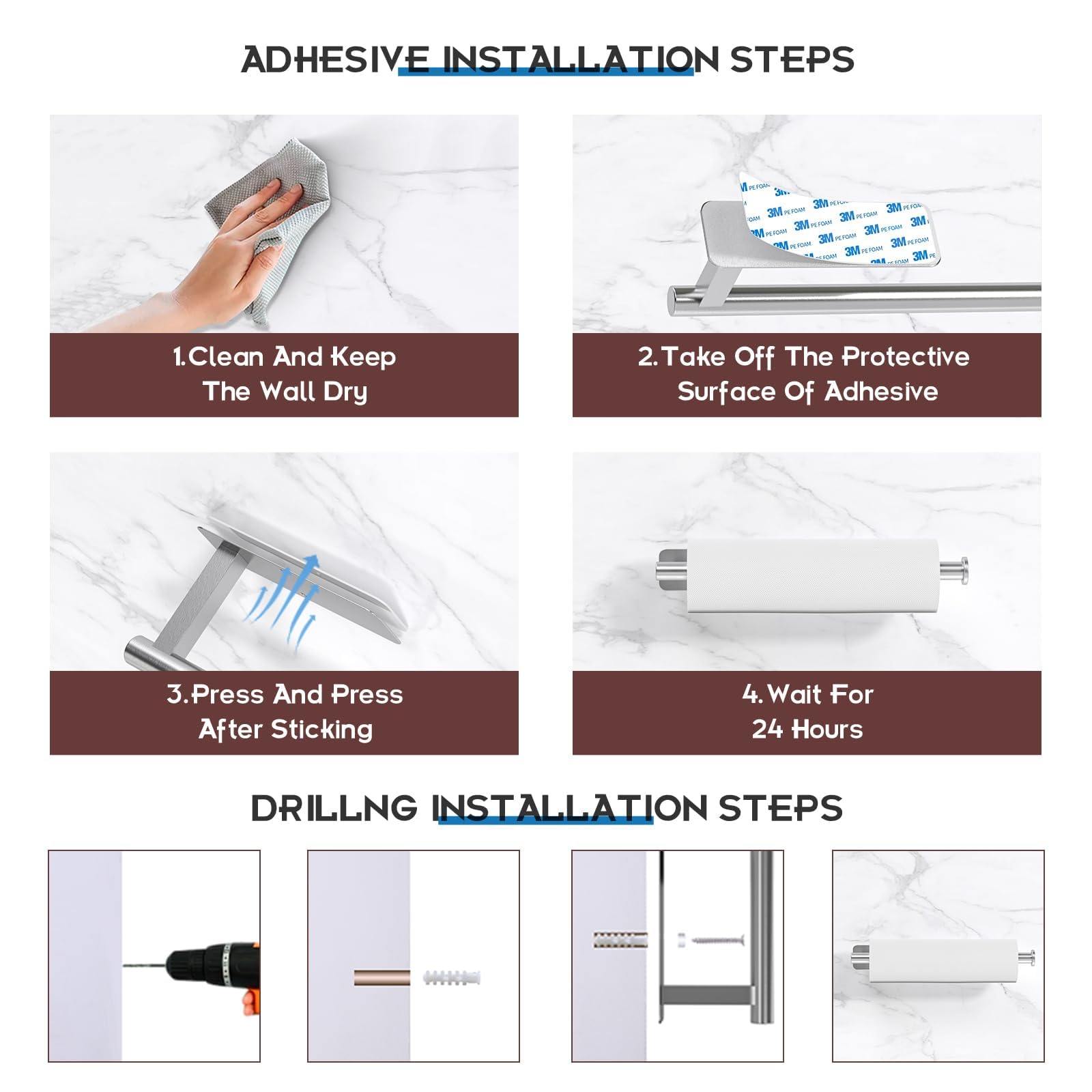 - ☞【Multiple Installation Options】: Applicable for both adhesive and screws. Self adhesive paper towel holder design suits smooth surfaces as tiles, glass, wood, marble, metal. Install and fix with auxiliary stickers, press stick on paper towel holder for about 20 seconds then use it after 24 hours. On rough surfaces, paper towel holder wall mount can be installed with screws