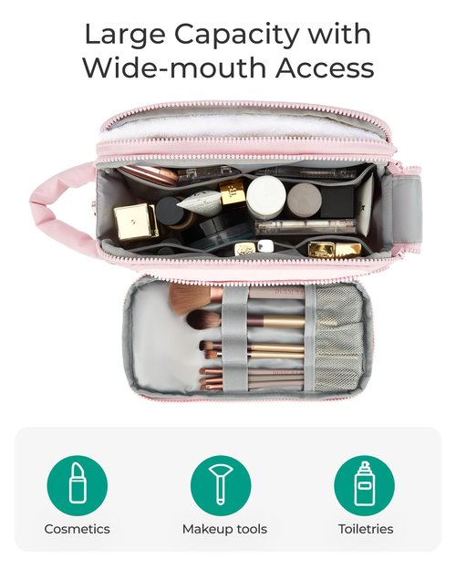- Easy to Use: The wide opening provides effortless access to your cosmetics, and the double zipper allows for quick entry into the main compartment. Just pull the attached zipper head to fully unzip and reach your items with ease. BAGSMART Travel makeup Bag is the perfect travel companion!