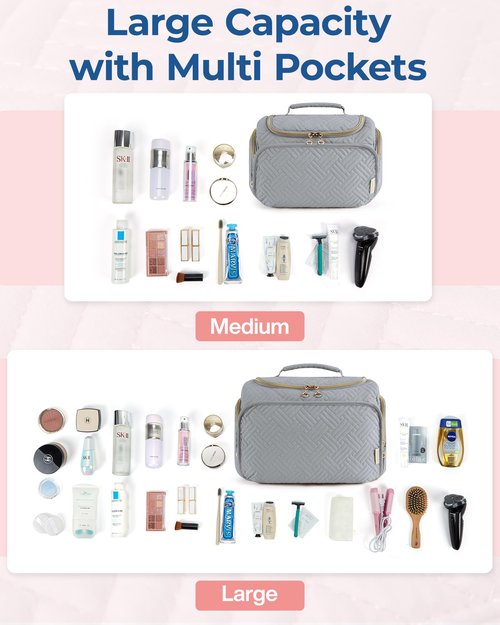 - 𝐋𝐚𝐫𝐠𝐞 𝐂𝐚𝐩𝐚𝐜𝐢𝐭𝐲: Medium size - 10.2''L x 5.5''Wx 7.3''H. Large size - 12.2''L x 7.1''Wx 8.7''H. The travel toiletry bag can perfectly organize your necessary travel toiletries and makeup storage