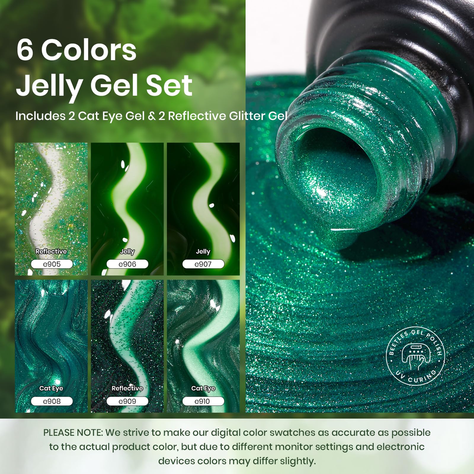 Beetles Gel Polish Green Gel Nail Polish Set, Cat Eye Jelly Gel Polish with Color Swatch Dots Magnet, 6 Color Glitter Enchanted Forest Theme for Salon Gel Manicure Nail Art DIY at Home