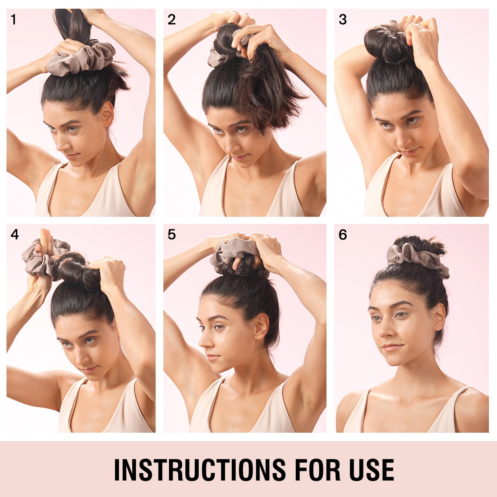 - 【HOW TO USE】1. Brush your hair dry; 2. Gather your hair Into a high ponytail ; 03. Place sleep hair tie around your wrist ; 4. Pull up your ponytail; 5. Loop your ponytail around the arch ; 6. Pull tightly for optimal results and continue wrapping; 7. Twist The scrunchie in a figure eight to secure your wrapped hair; 8. Go to sleep and wake up with a perfect hair.