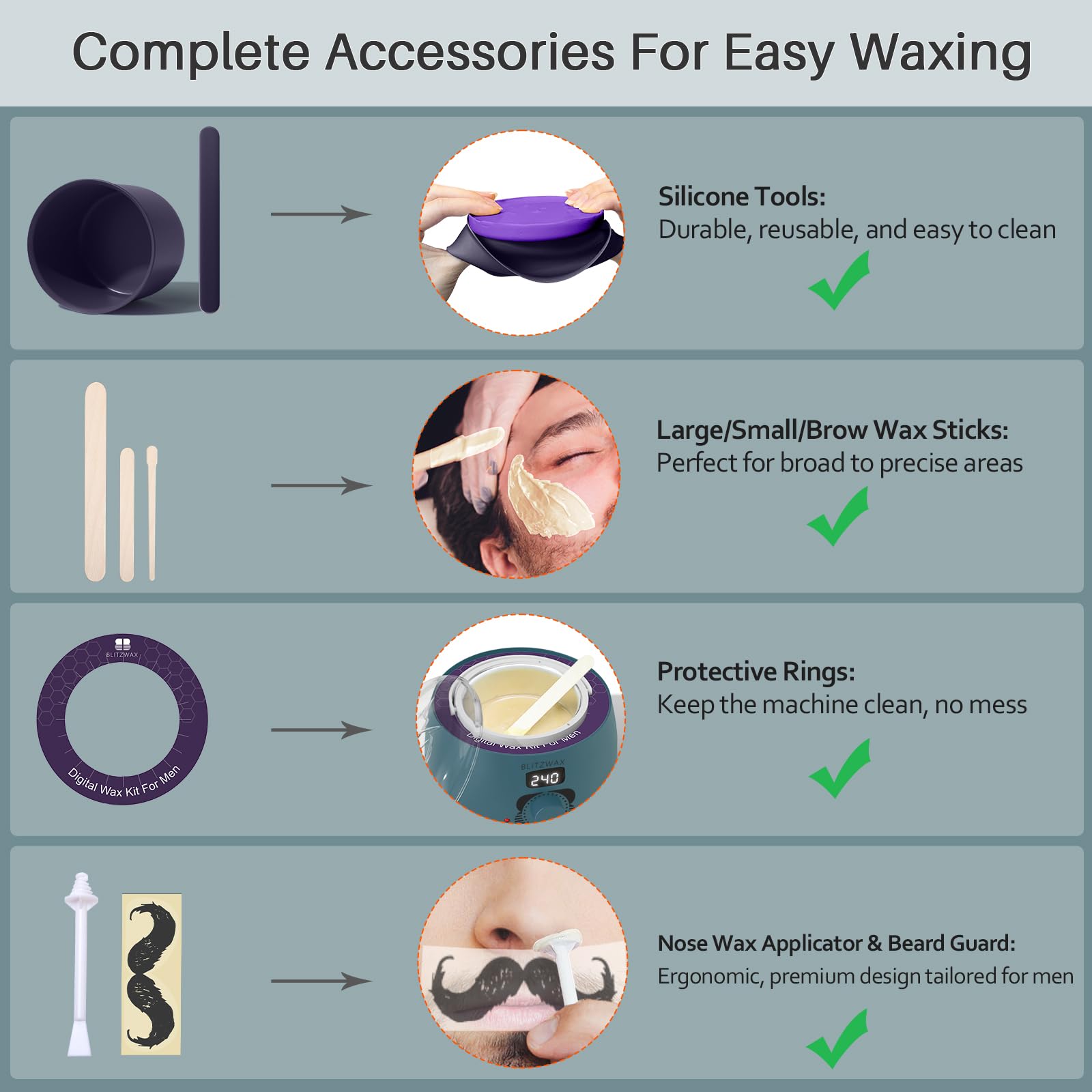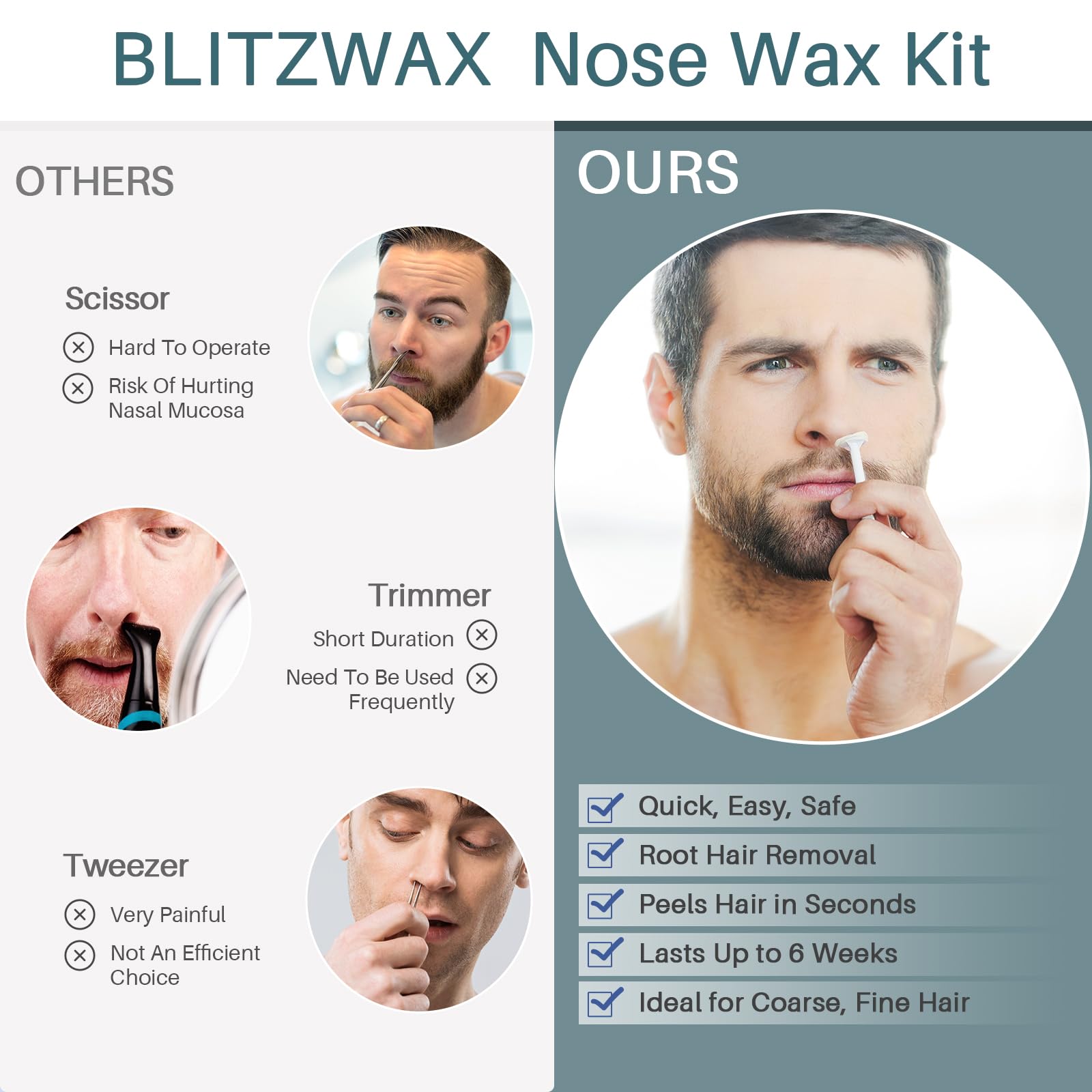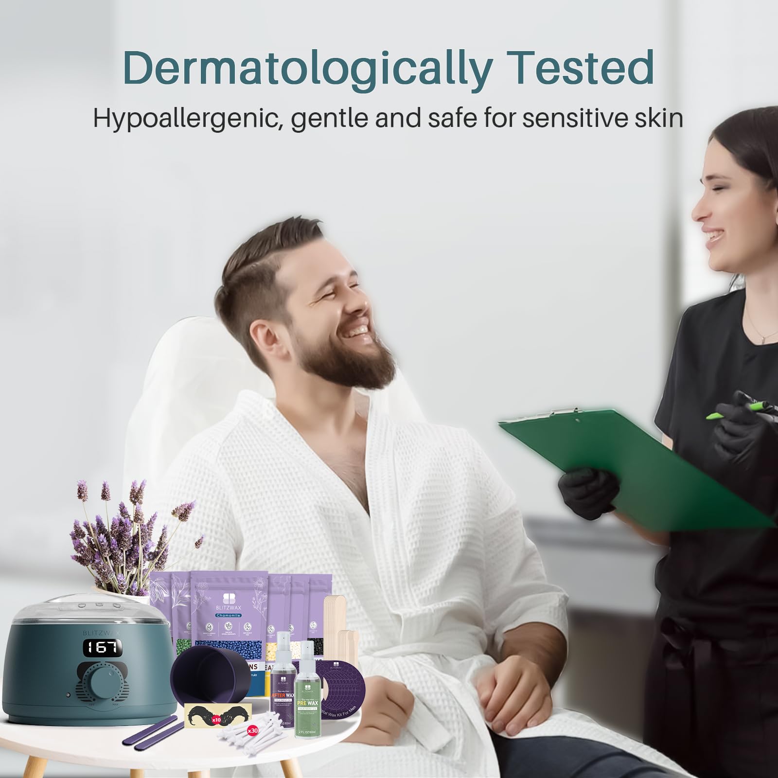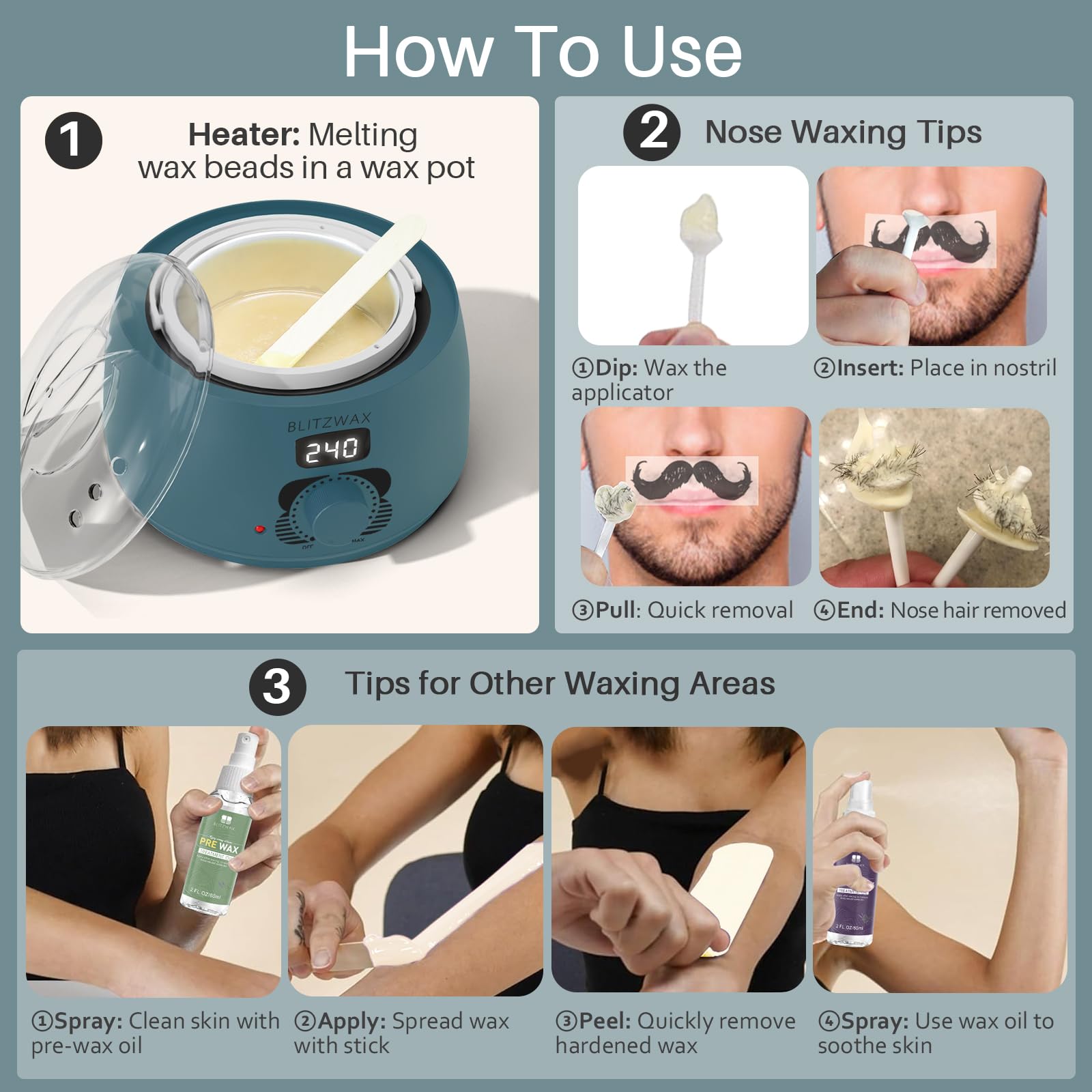 BLITZWAX Back and Nose Waxing Kit for Men, Hard Wax Warmer for Brazilian, Body and Face, At Home Hair Removal Kit, Beginner Friendly, Quick Heating, 93 Accessories, Blue Spruce