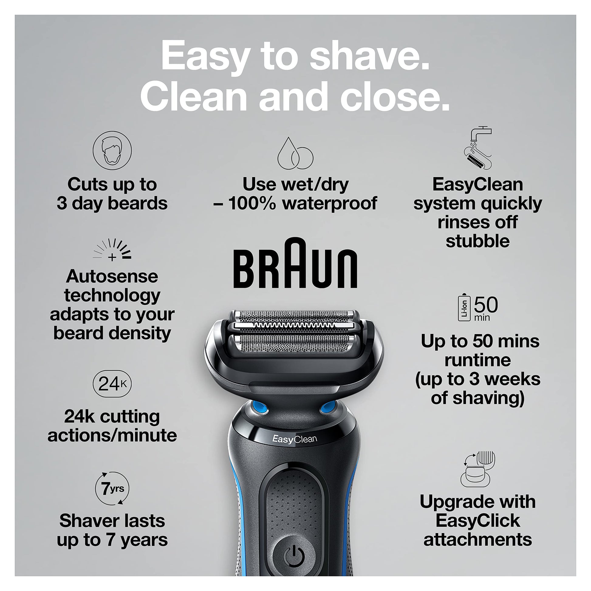 Details: Close shaving is made easy with the Braun Series 5 Electric Shaver. This wet and dry foil shaver features three flexible blades that adapt fluidly to your facial contours. Plus, AutoSense technology reads and adapts to your beard, capturing and cutting more hair in every shave. For quick and easy cleaning, this Braun Series 5 Shaver has an EasyClean system that allows you to thoroughly rinse stubble off your electric razor without the need to remove the shaver head. The included precision beard trimmer attachment makes mustache and sideburn trimming simple-and with the convenient EasyClick design, you can easily swap out shaver attachments to accommodate a variety of grooming needs. Braun Series 5 Electric Shavers for men use a powerful Li-Ion battery that provides up to three weeks of shaving (50-minute runtime) and a 5-minute quick charge option. These wet and dry shavers are 100% waterproof and can be used with foam, gel or even under the shower. Each shaving kit includes a Smart Plug charger for automatic 100 to 240 voltage adjustment. All Series 5 electric razors for men are made in Germany with premium craftsmanship.
