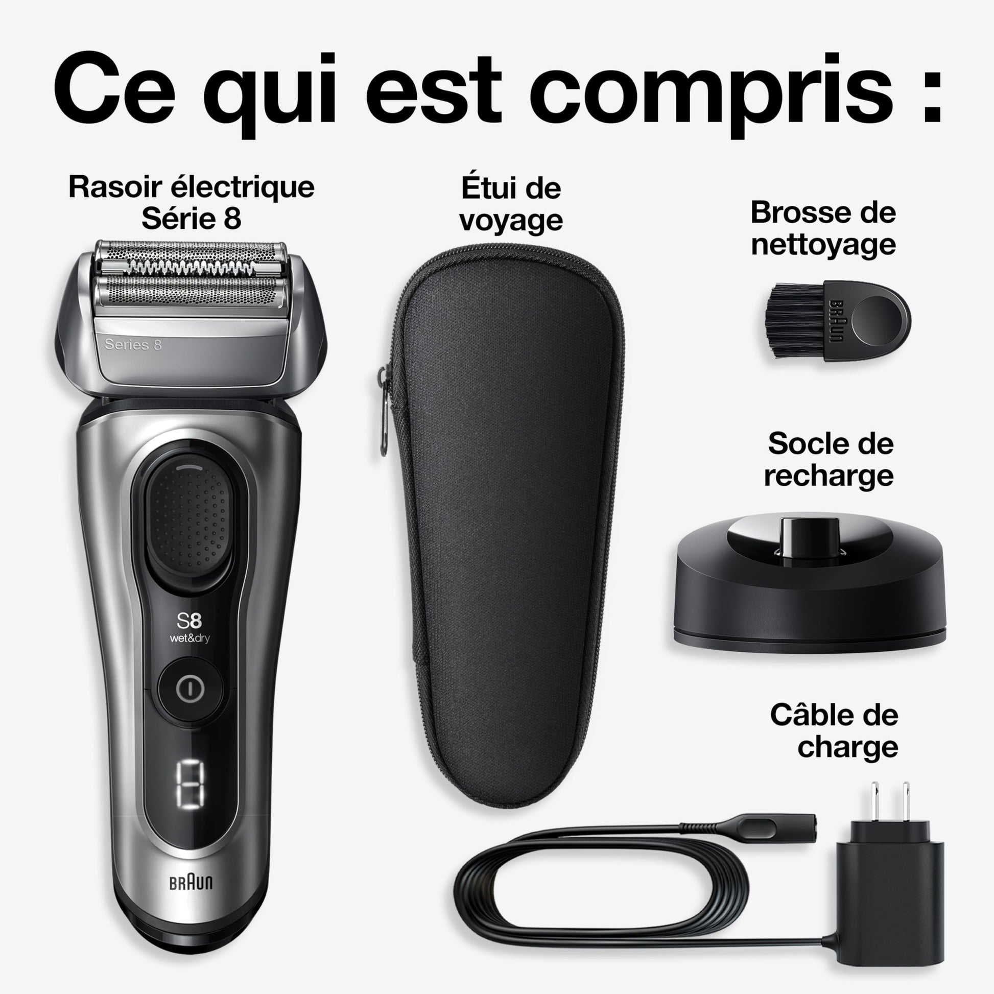 - INCLUDES: Braun Series 8 8517s Men's Electric Shaver with built-in Precision Trimmer, Galvano Silver, Fabric Razor Travel Case, Charging stand and Cleaning Brush