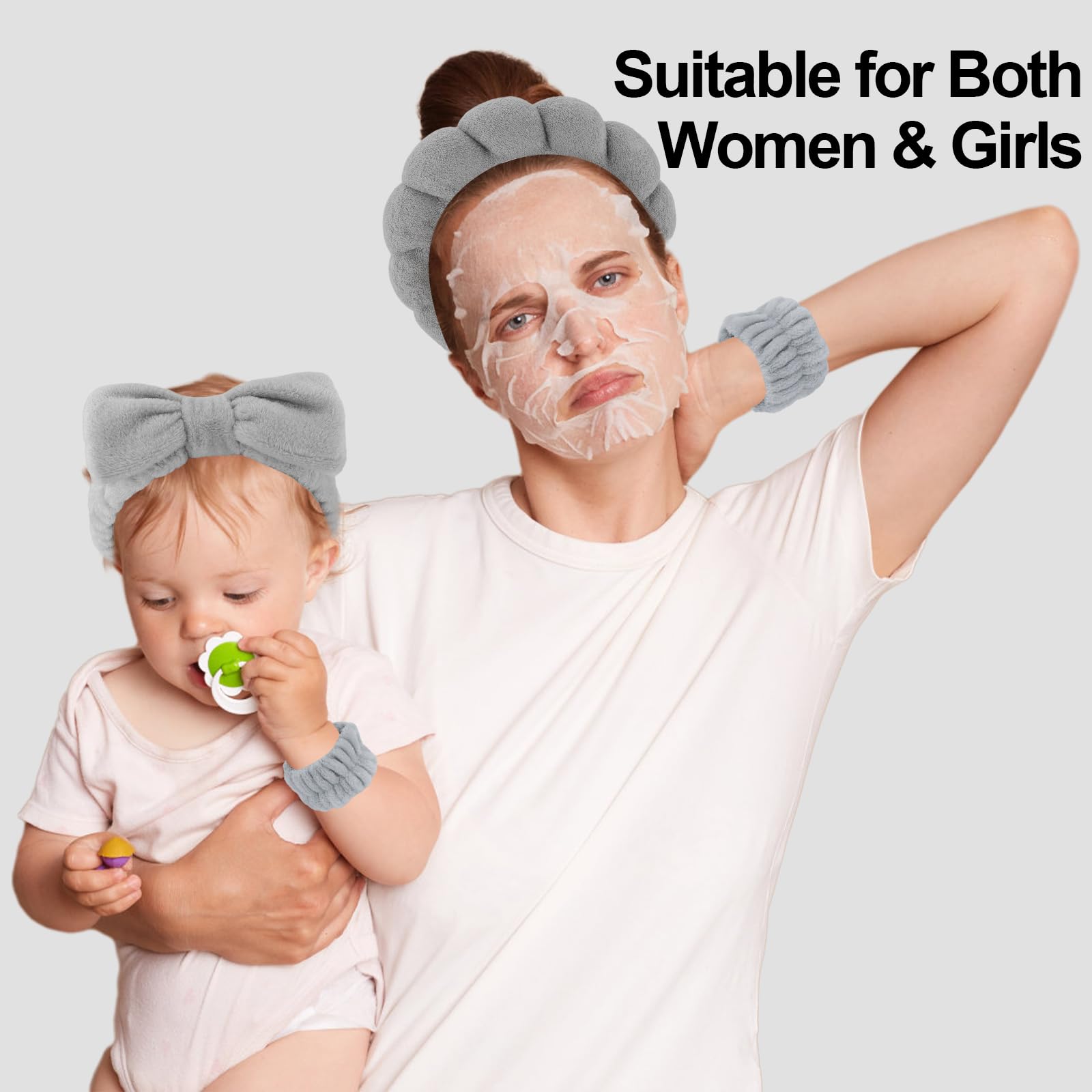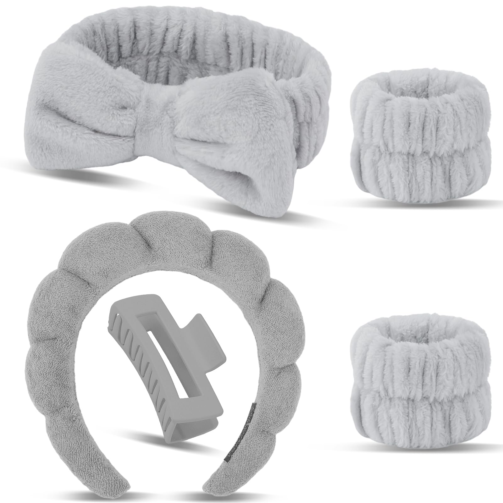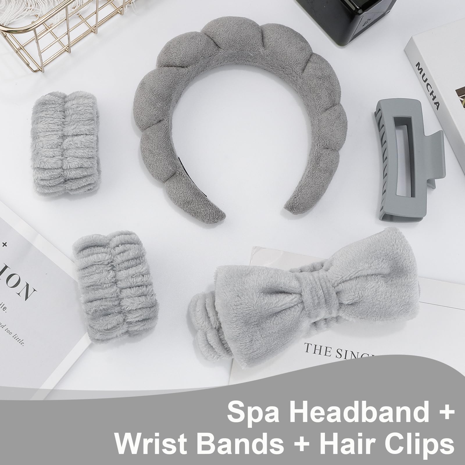 Canitor Sponge Spa Headbands Wristband Set with Hair Clips Skincare Headbands for Washing Face Non Slip Puffy Terry Cloth Makeup Headband Face Wash Wrist Bands Cute Trendy Stuff (gray)