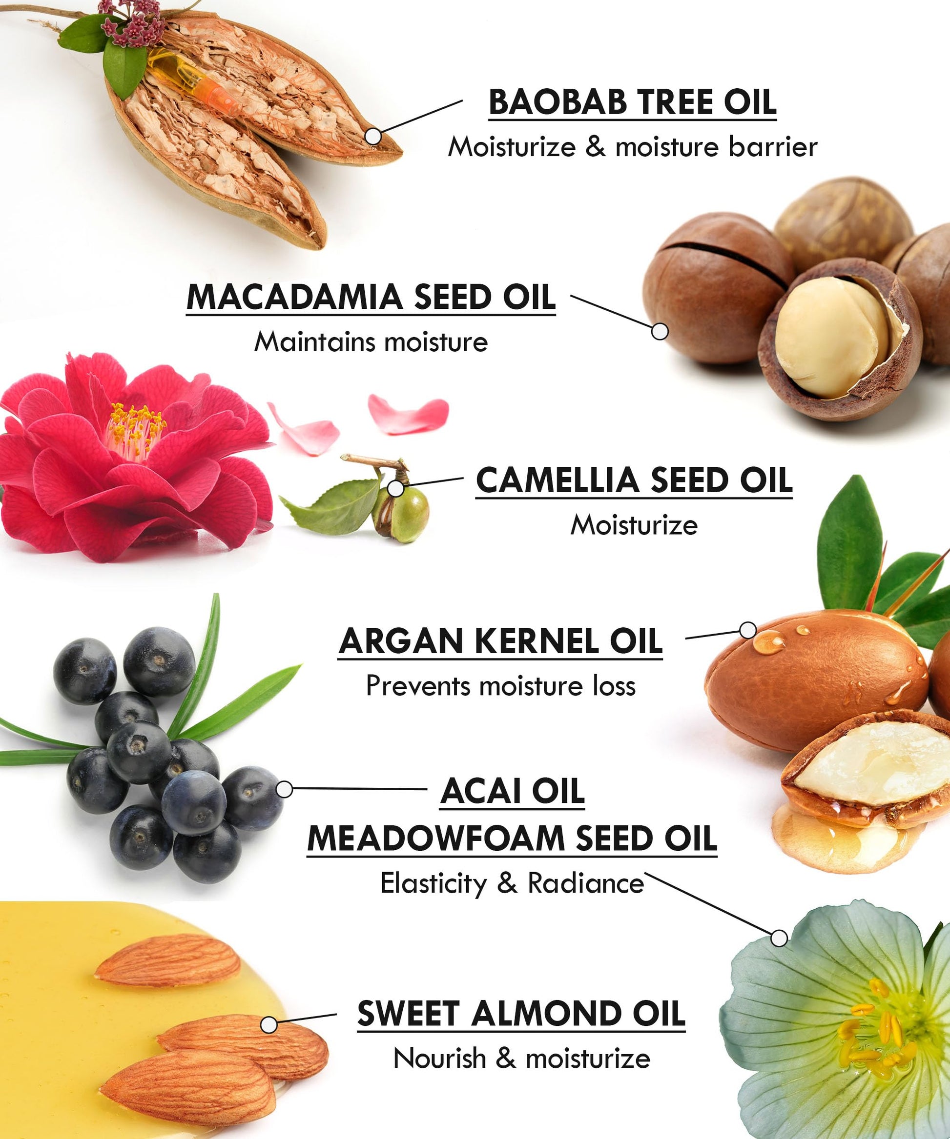 - ✅ 7 FACIAL OIL BLENDS. Infused with baobab tree, macadamia seed, camellia seed, argan kernel, Asian palm fruit, meadowfoam, and sweet almond oils, this face cleansing oil fortifies the skin moisture barrier to enhance its moisture retention ability and provides optimal hydration.