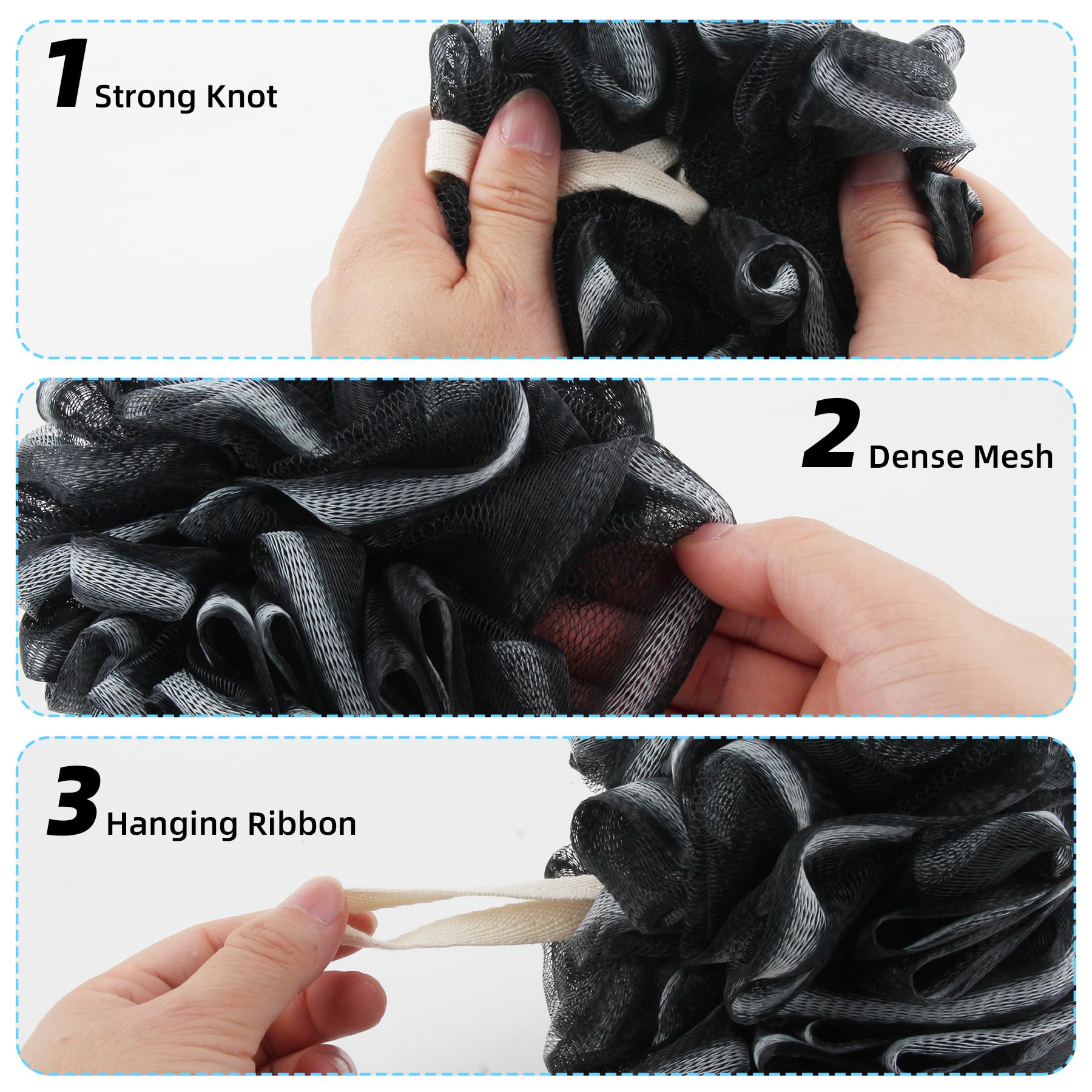 - Durable and stable: Multiple knots fixed, the loofa is not easy to disperse! The firmness and durability of the internal connections of the shower loofah ; Ribbon lanyard for easy hanging and drying