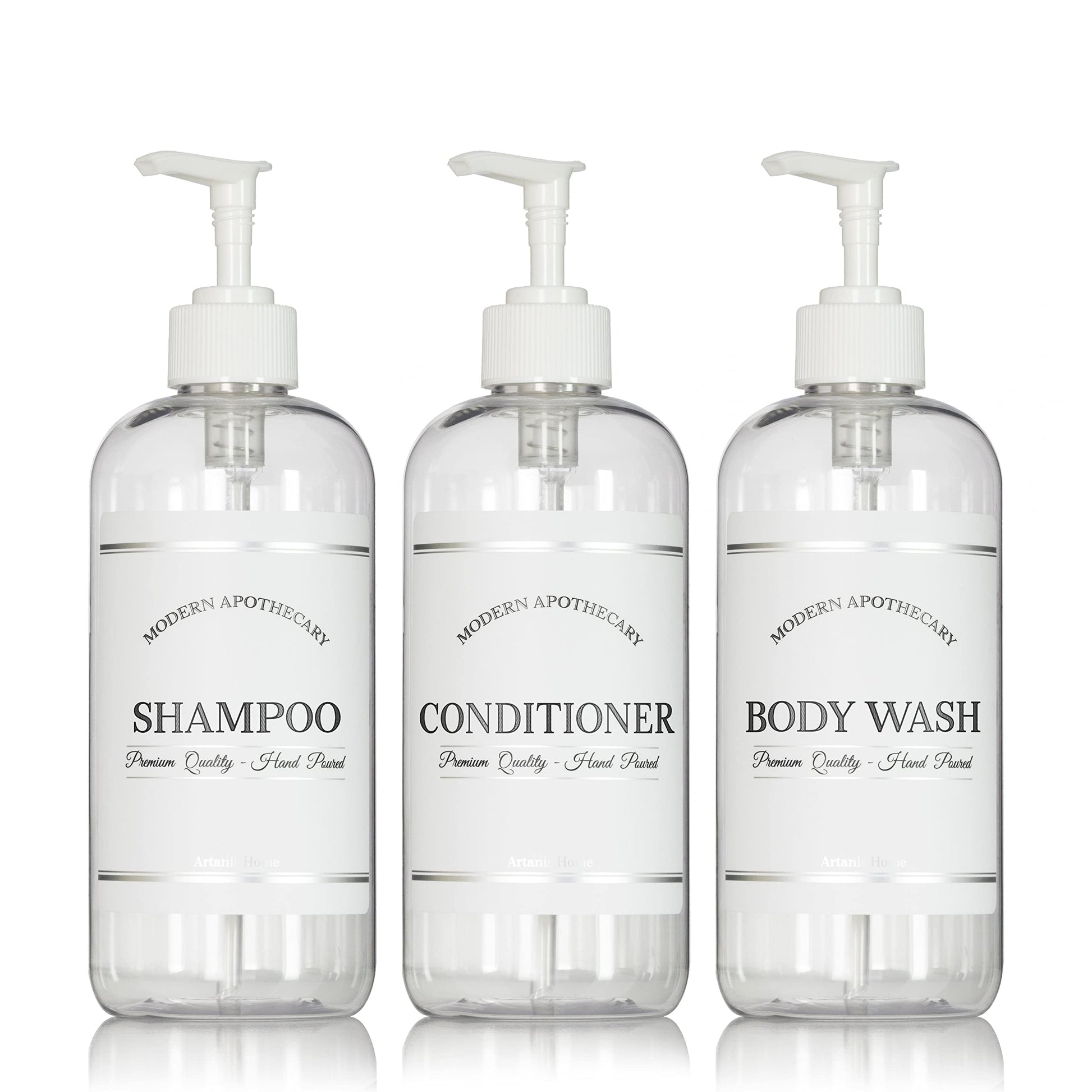 - Bring Style To Your Bathroom: Revel in the luxury of a well-organized shower. Refine your interior decor with these chic body wash, conditioner and shampoo dispenser bottles. Curate your whole home. Modern Apothecary bathroom bottles coordinate with additional matching titles for the sink, kitchen, office, and rentals. Classy, with a touch of retro flair