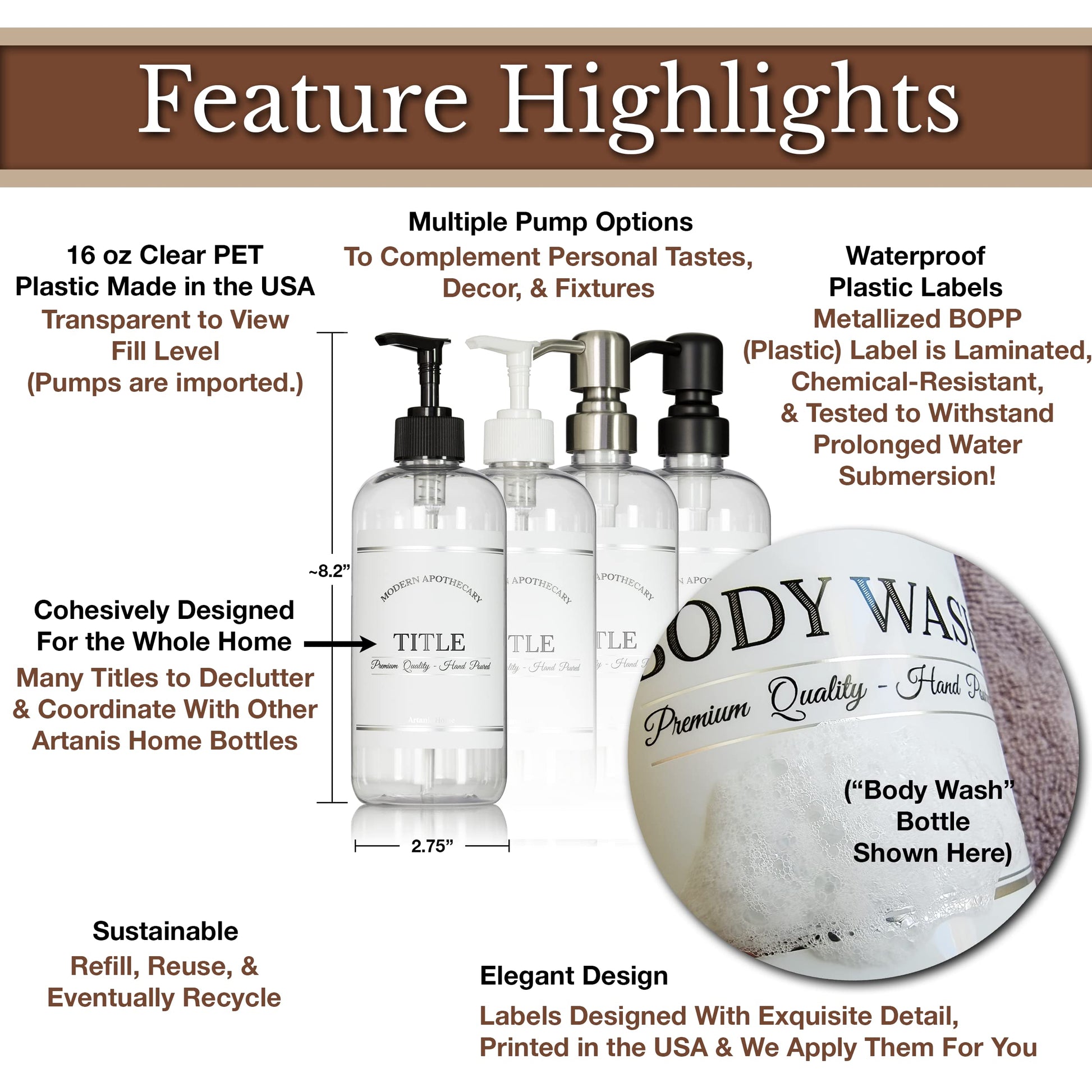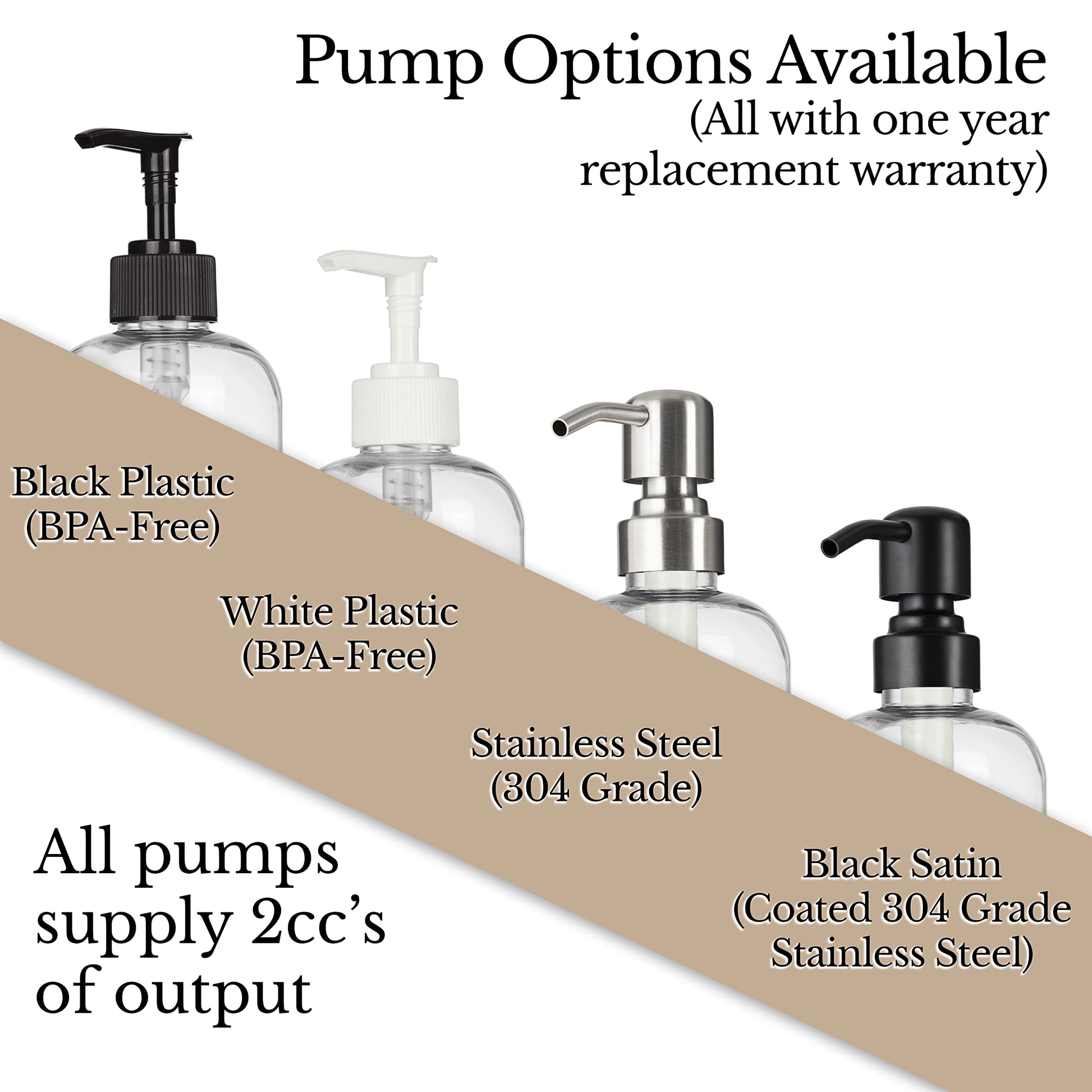 - Simple Details Have Grand Effects: Choose from an array of 4 beautiful pump options. Your plastic shampoo bottles with pump include plastic or 304 grade stainless steel pumps. Select the one that best matches your home decor. The waterproof chrome-accented labels are the finishing touch, like jewelry for your bathroom