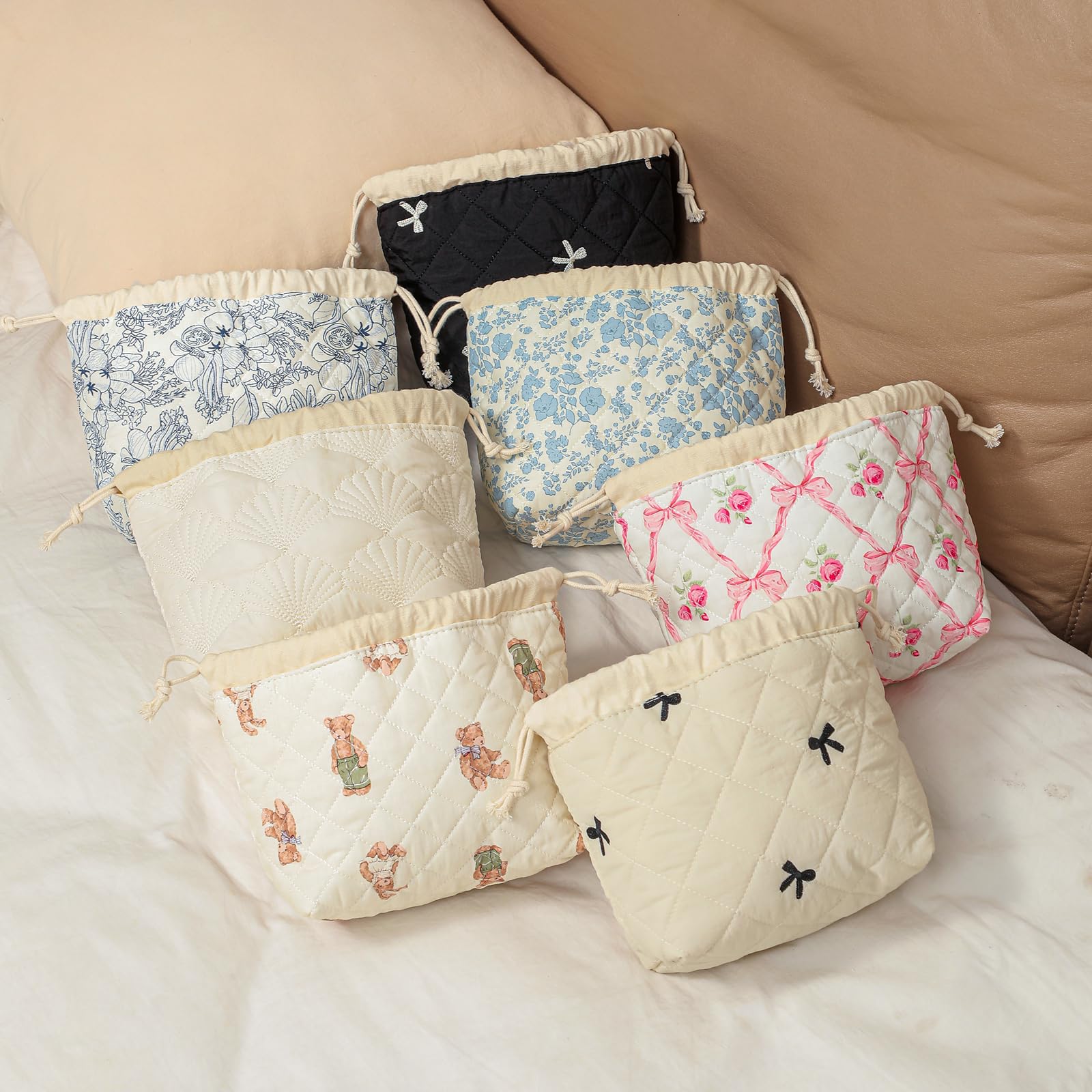 Cotton Quilted Drawstring Makeup Bag with Canvas Lining,Coquette Aesthetic Cute Travel Toiletry Bag,Drawstring Gift Bag for Women and Girls(03Pink Bows)