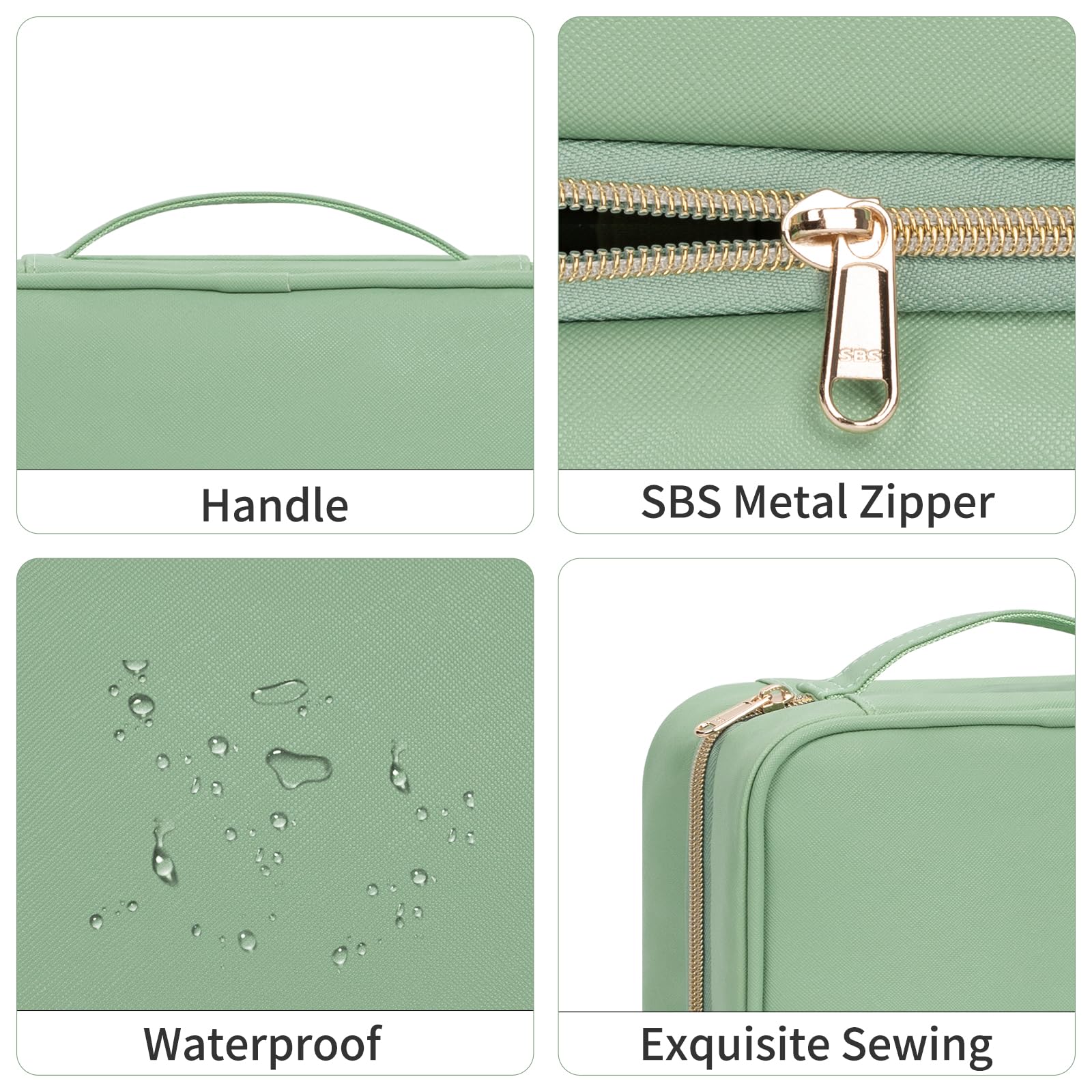 CUBETASTIC Hanging Travel Toiletry Bag, Portable Green Makeup Bag with Handle, 3 Compartment Small Travel Bag for Toiletries Waterproof Leather Cosmetic Organizer Pouch with 360° Hook