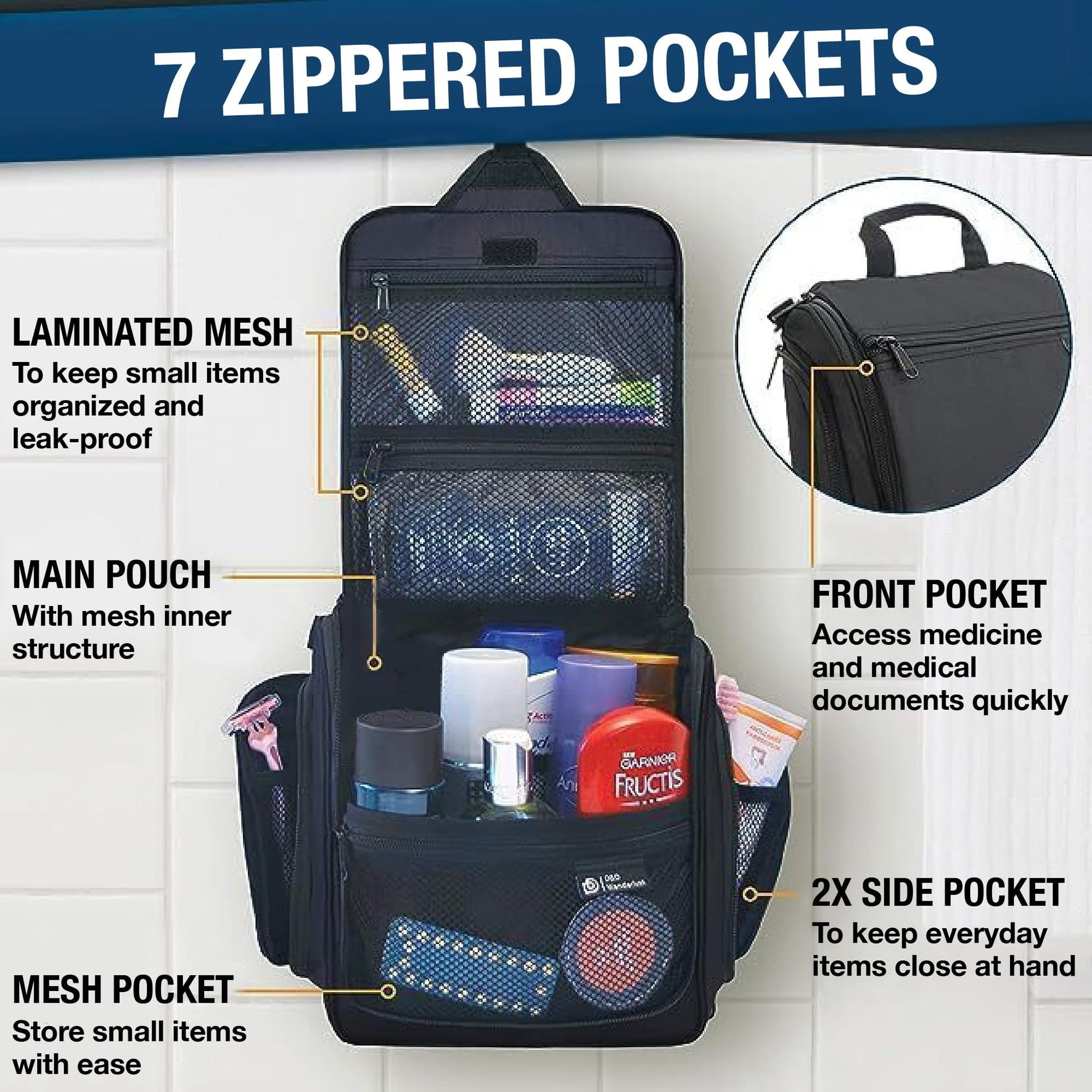 - Convenient Hanging Hook: The XXL metal swivel hook allows you to hang the bag anywhere, saving valuable counter space. It's perfect for use in hotels, bathrooms, or even on a camping trip.