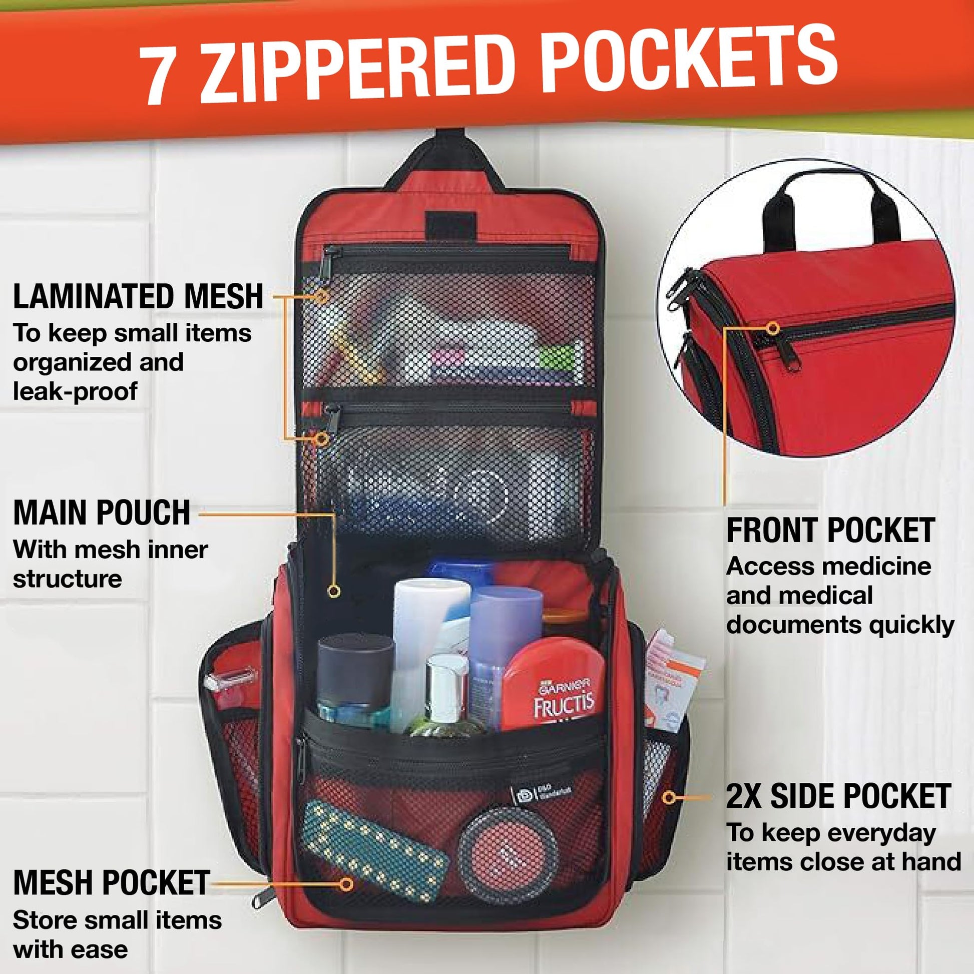 D&D Hanging Travel Toiletry Bag for Men and Women – Cosmetics, Makeup and Toiletries Organizer Kit with 10 Compartments, YKK Zippers, XXL Metal Swivel Hook, Water-Resistant Nylon
